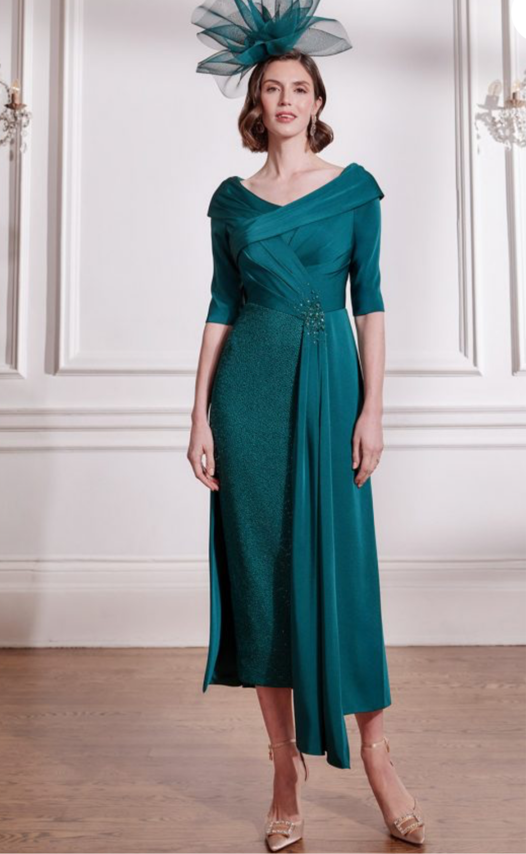 A stunning combination of signature luxe sparkle fabric and tonal crepe, featuring a fitted underlayer with a flowing A-line overskirt. Beaded detailing at the waist adds a touch of elegance, while draped crepe falls gracefully down the front of the dress. The design is completed with an on-the-shoulder neckline and 3/4 sleeves for a sophisticated finish.