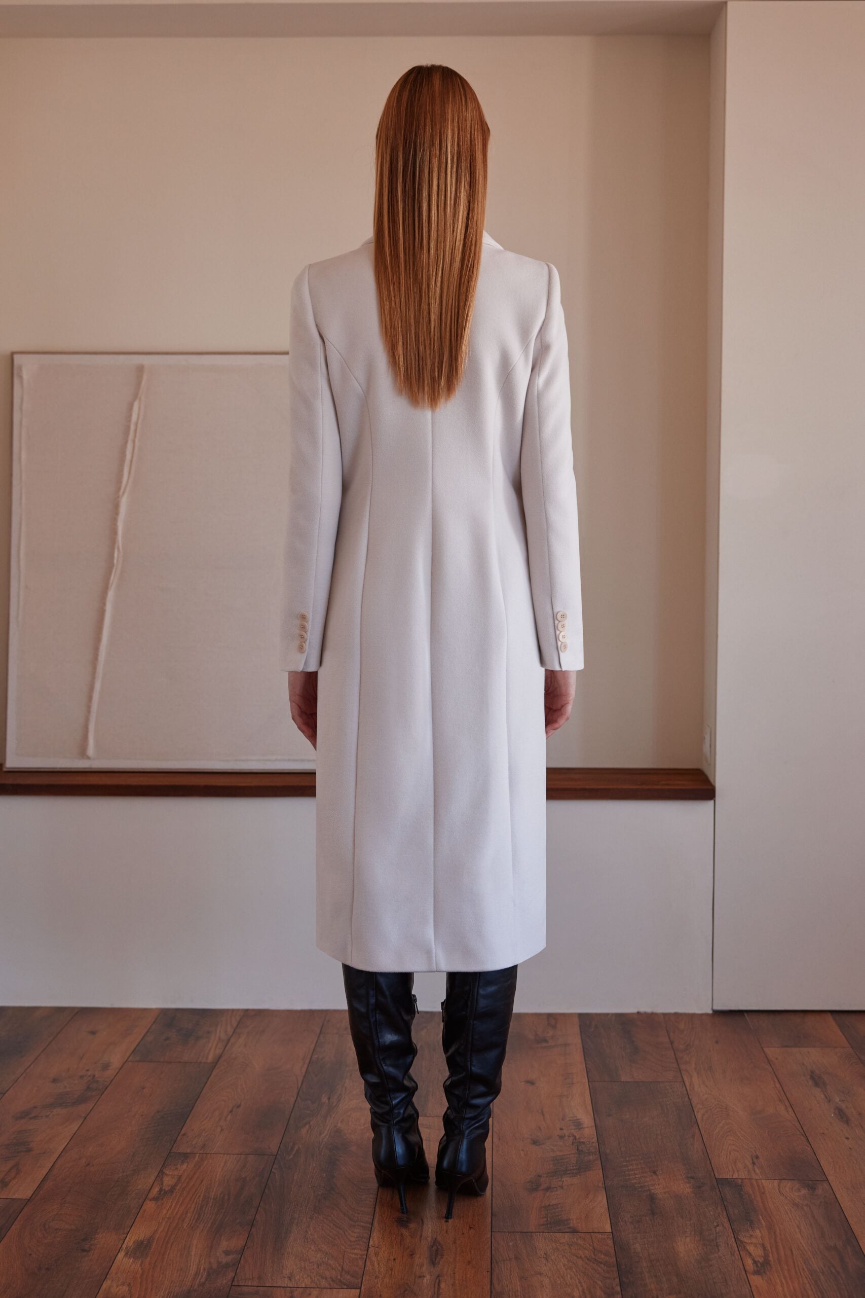 Step into timeless elegance with this Argiddo tailored coat in a refined cream shade. Designed with a sleek longline silhouette, this piece brings sophistication and versatility to your wardrobe.