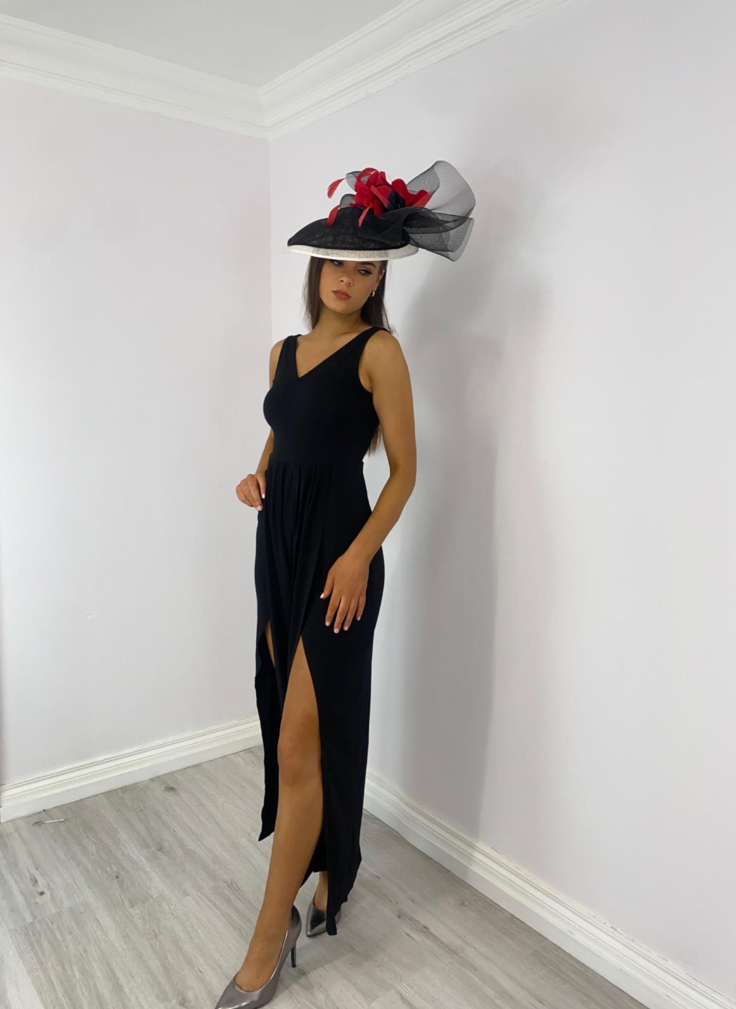 A stunning classical black jumpsuit with a wide leg and from slit to give it a modern design.
