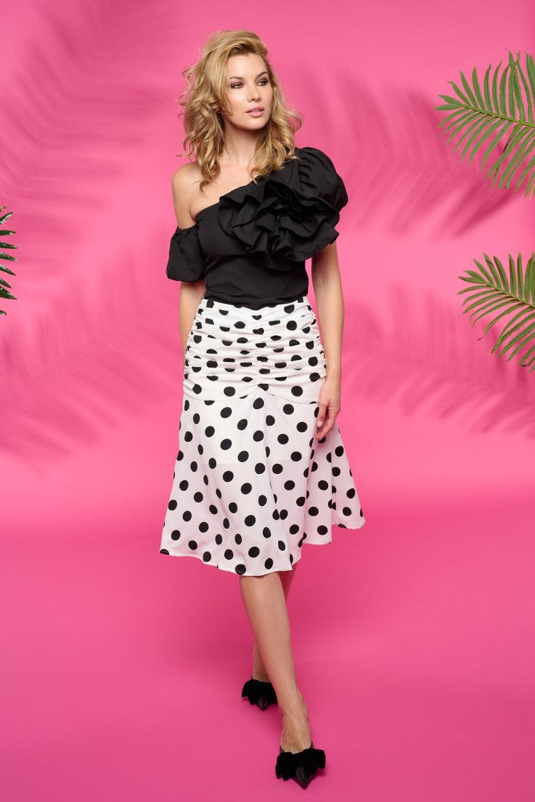 Gorgeous one shoulder top with asymmetrical neckline and flower details on front .