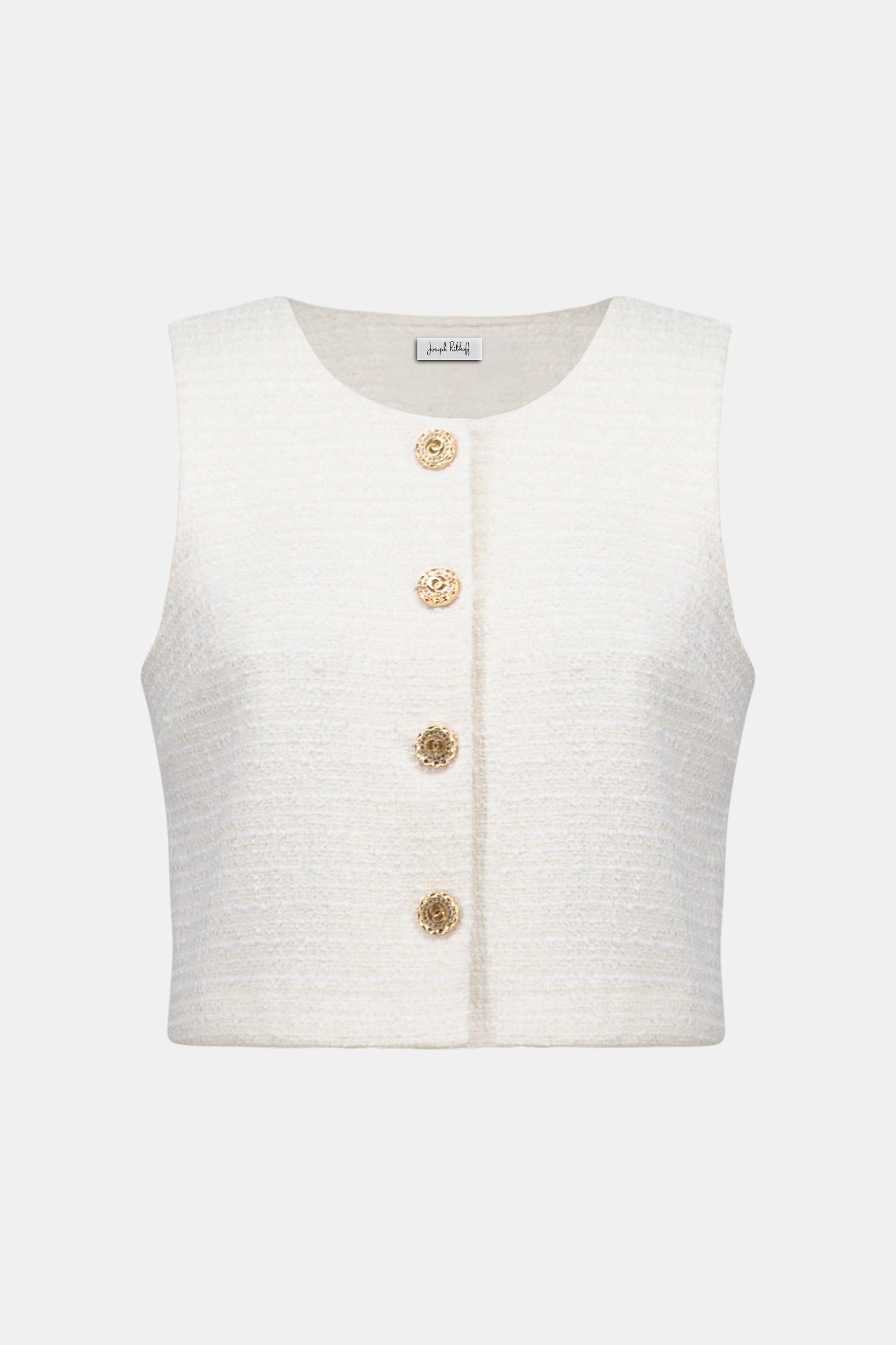 Designed with clean lines and tactile texture, this bouclé vest features a scoop neckline and a sleeveless cut. Gold buttons at the front add a refined, standout finish.