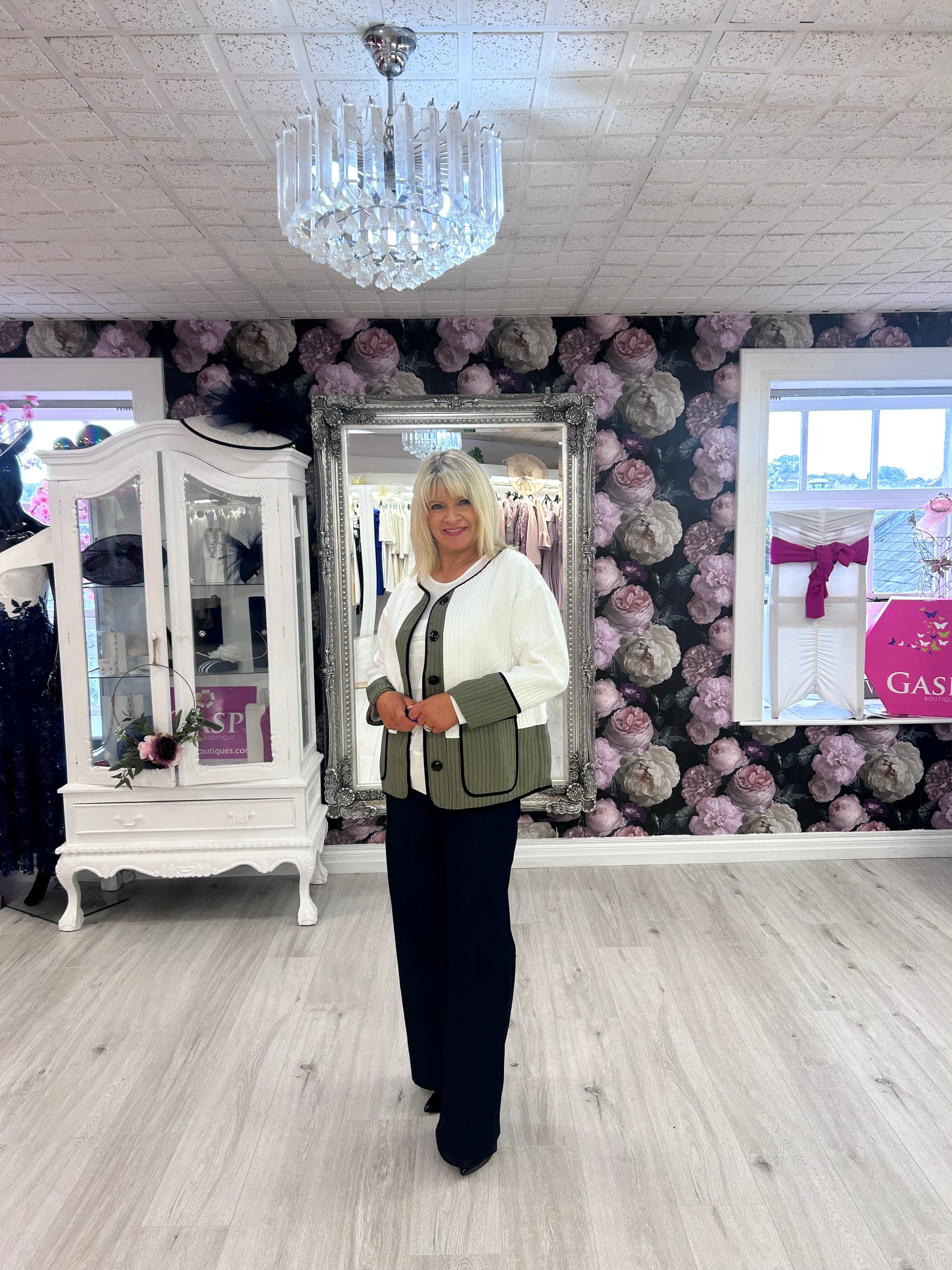 - Neutral cream tone with olive green easy to pair with any wardrobe