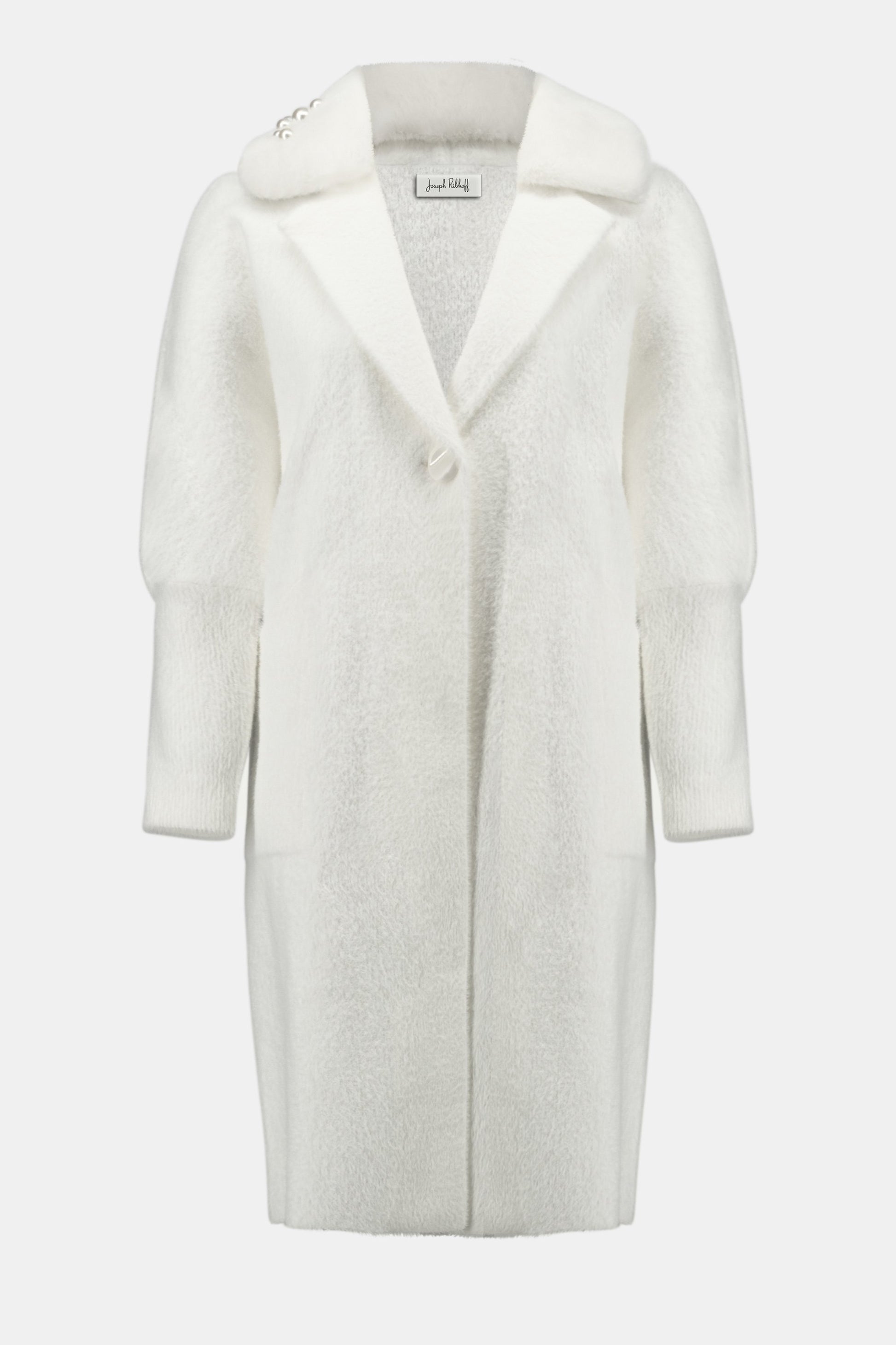 A detachable faux fur collar and cuffs add an opulent touch to this sweater coat, while the notched collar and patch pockets lend timeless sophistication. Crafted from soft feather yarn with a beautifully draped silhouette, it’s an elegant choice for cooler days.