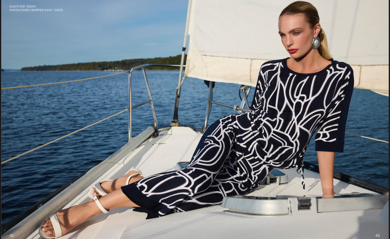 Frank Lyman – 266114 – Midnight/White – Top – Step into effortless style with this Frank Lyman pullover. Featuring a regular fit and hip-length design, it offers both comfort and versatility. The ruched drawstring and abstract pattern add a chic touch, while the crew neck and 3/4 straight sleeves provide a casual yet polished look. Perfect for both office and casual settings, this piece seamlessly blends style and functionality.