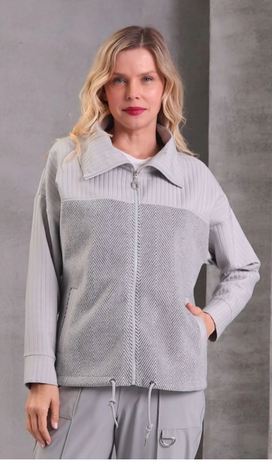 A modern take on casual outerwear, this light grey zip-up jacket combines comfort with refined detailing. It features a mix of textures—ribbed panels on the sleeves and shoulders paired with a subtle herringbone pattern across the body—for a sophisticated, layered look. The high collar, front zip closure, and adjustable drawstring hem add practicality, while side pockets enhance everyday wearability. Effortlessly versatile, this jacket transitions seamlessly from laid-back weekends to polished casual outfits.