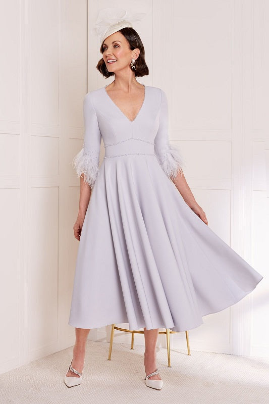This John Charles dress is an elegant, soft dove-grey piece that blends understated luxury with a touch of drama. It features a flattering V-neckline trimmed with delicate beading, adding quiet sophistication. The fitted bodice defines the waist with two subtle, bead-lined seams before flowing into a graceful A-line skirt that moves beautifully. The standout detail is the sleeves: three-quarter length, embellished with pearls and finished with lavish feather cuffs that give the dress a modern, couture edge. It’s the kind of outfit that says “refined” but refuses to be boring — perfect for a mother of the bride or a high-society event where quiet confidence does all the talking.