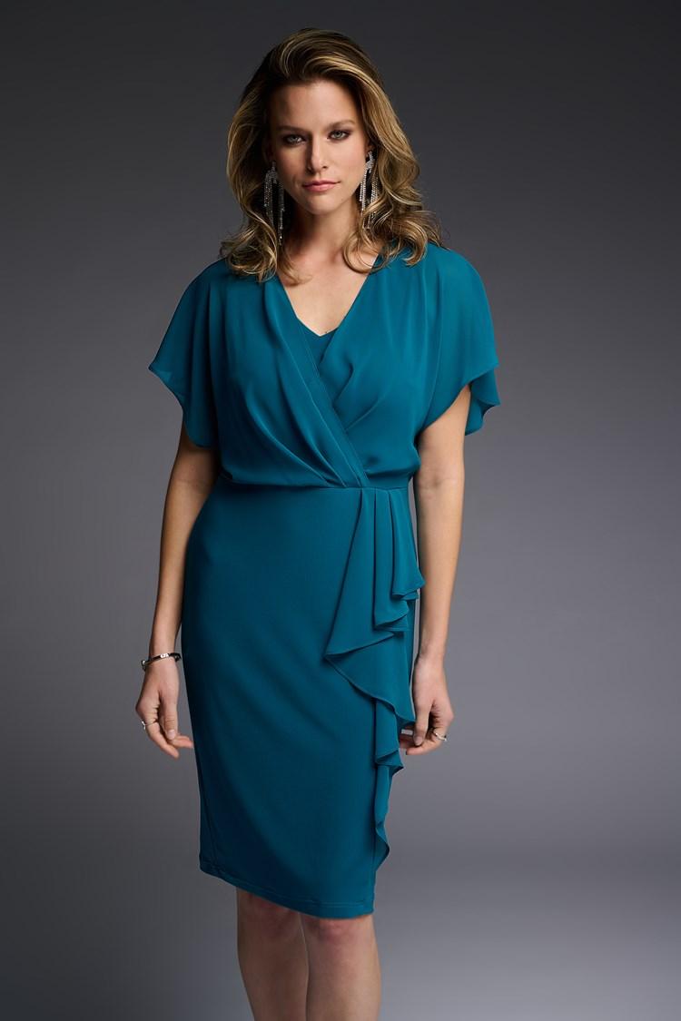 With a beautiful wrap front and fitted waist, this Joseph Ribkoff dress is a lovely choice for any special occasion. You'll love everything about it, from the soft fluted sleeves to the ruffled front, and above-the-knee hem.