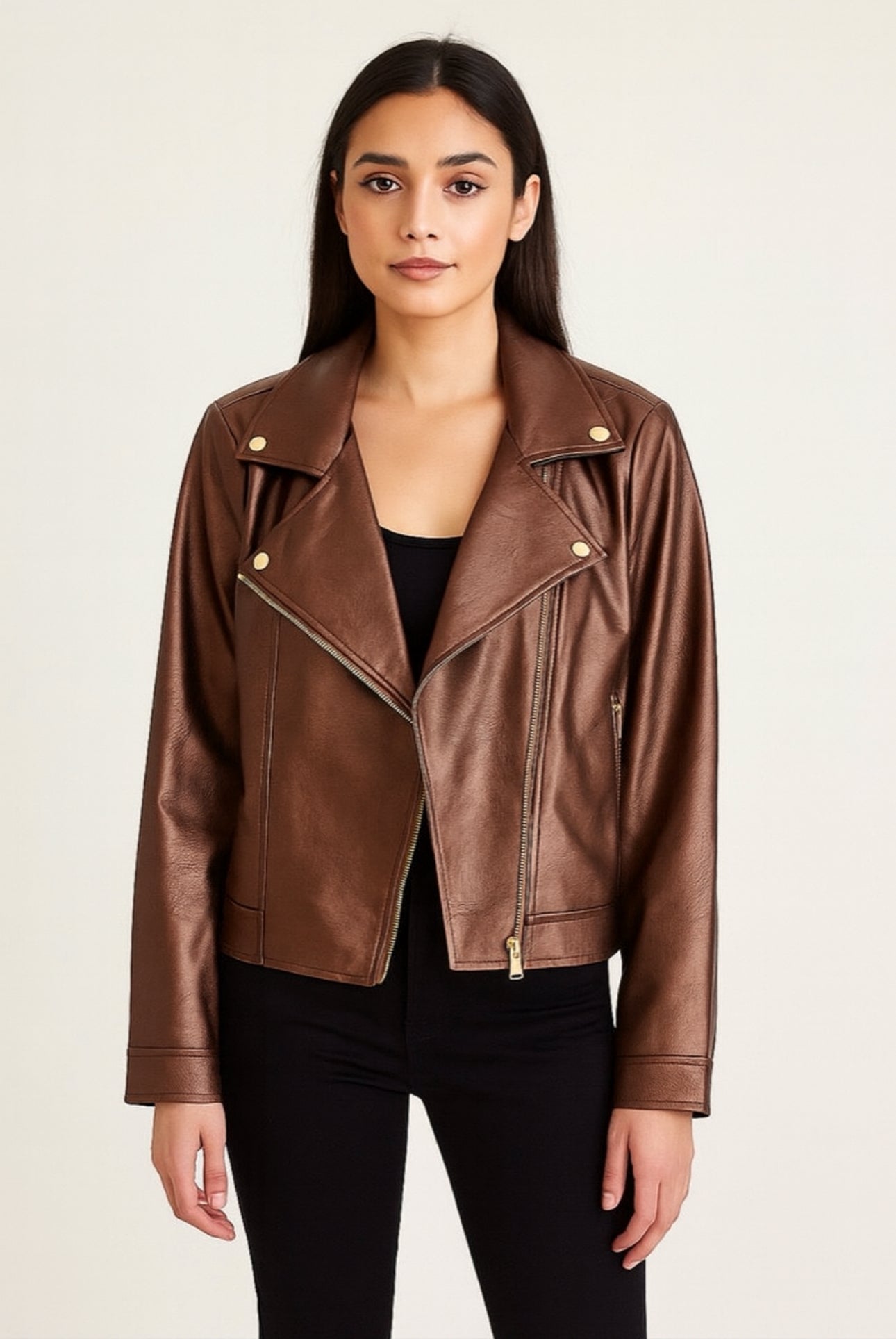 This stylish bronze faux leather biker jacket adds an edgy yet polished touch to any outfit. Featuring a classic lapel collar with gold-tone snap buttons, an asymmetrical front zip closure, and zippered side pockets, it’s both fashionable and functional. The smooth, structured finish gives it a sleek silhouette, while the cropped length makes it perfect for pairing with jeans, dresses, or tailored trousers. A versatile layering piece, this jacket transitions effortlessly from day to night.