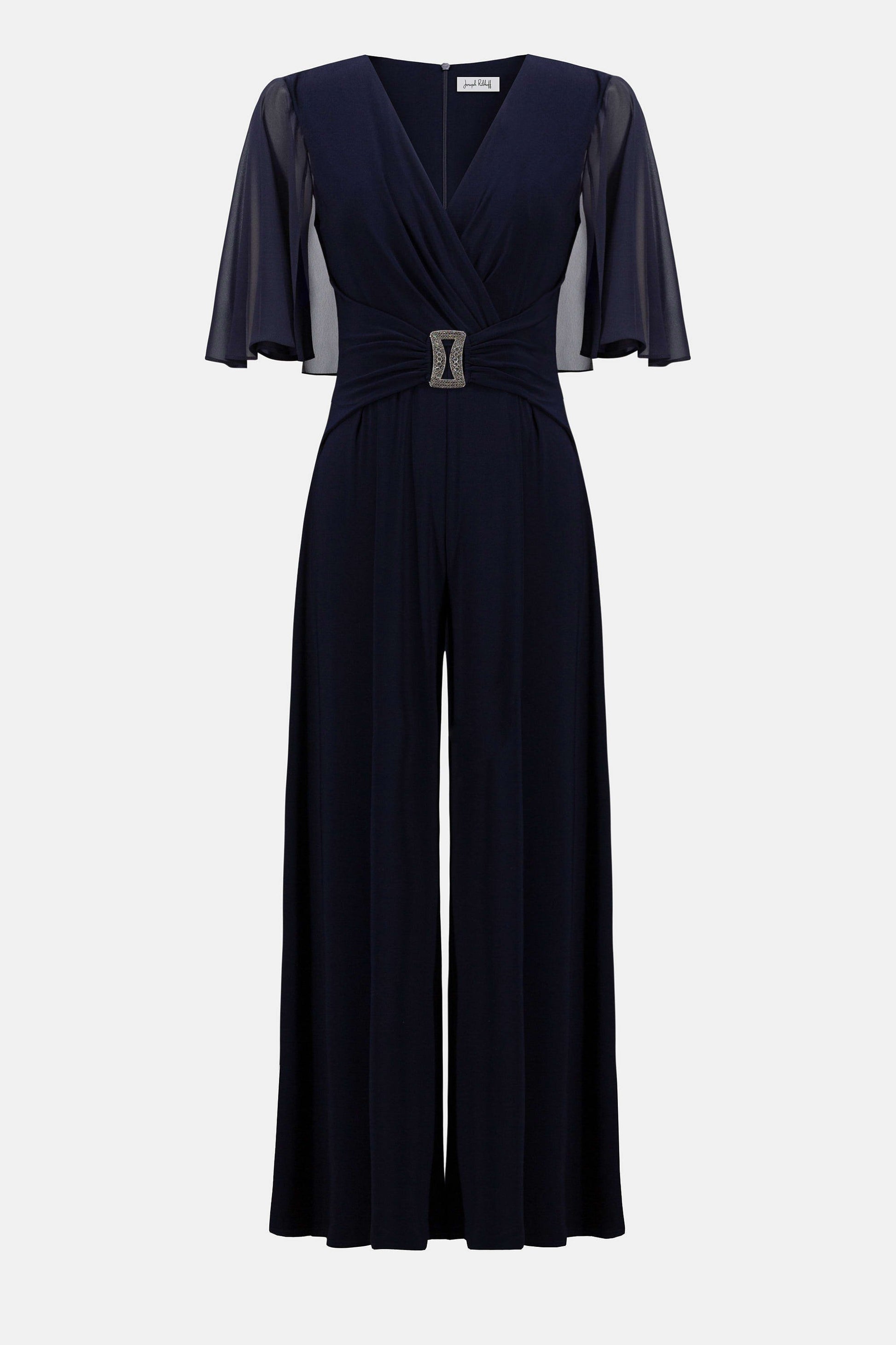 Gracefully refined, this silky knit and chiffon jumpsuit offers a sophisticated alternative to the classic formal dress. The wrap neckline beautifully accentuates the décolleté, while a waist tie adorned with a sparkling rhinestone detail enhances your silhouette. The pièce de resistance is the ethereal chiffon cape, elegantly draping over the shoulders and upper arms for a touch of timeless glamour. Completing the look, the wide-leg silhouette creates a leg-lengthening effect, perfect for making an unforgettable impression at any event. Part of the Signature Collection.