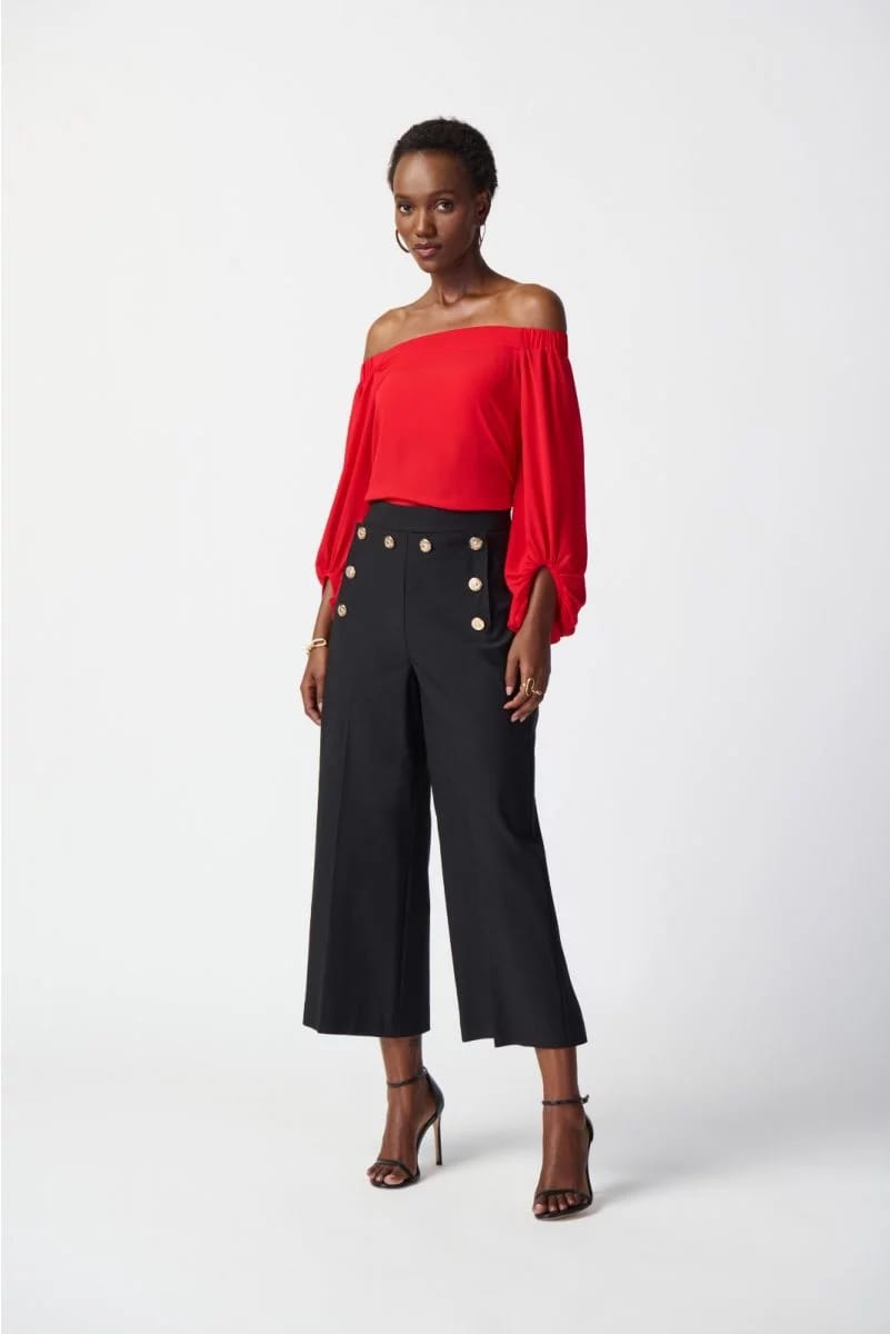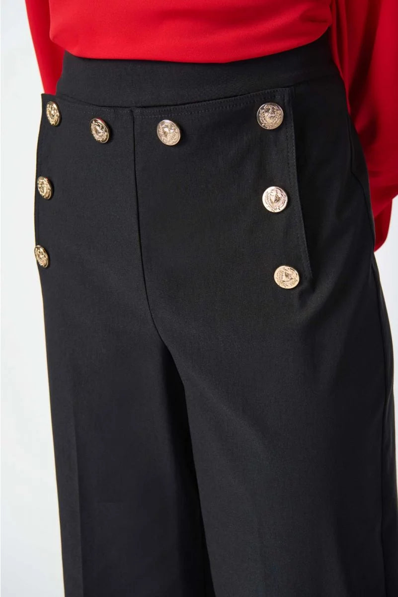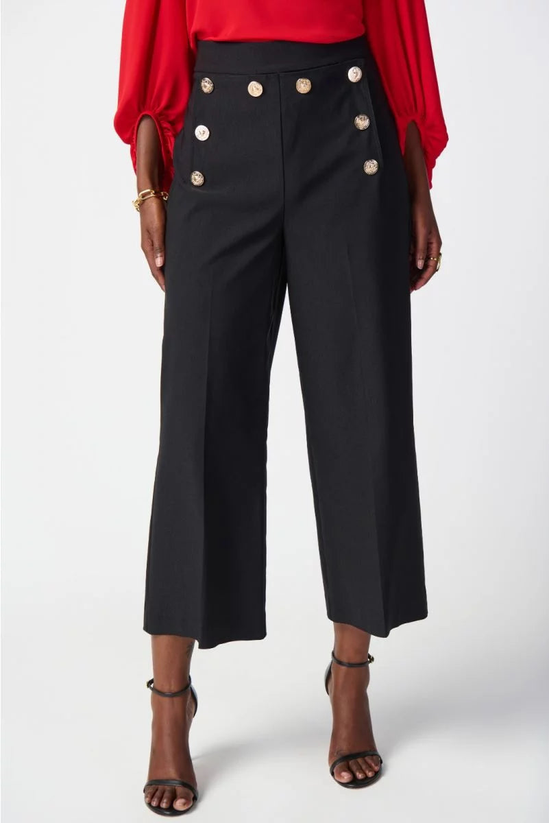 Explore a world of style with our choc cullotte pants ,featuring a faux front opening and gold nautical inspired buttons that exudes elegance.The cullotte cut gives a modern twist to this timeless design.