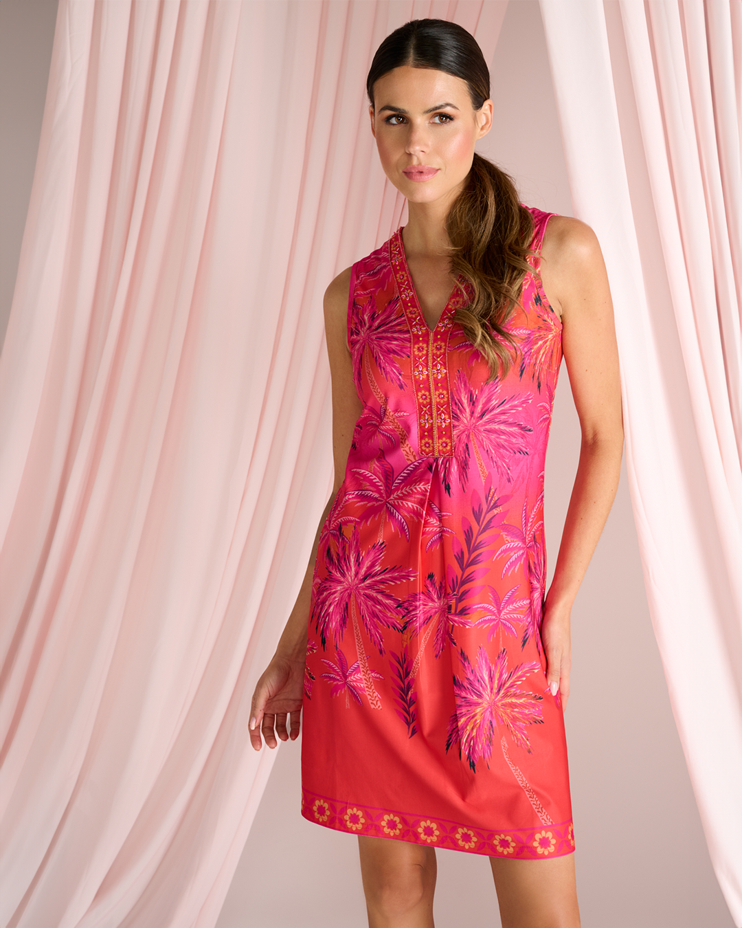The dress is a sleeveless, A-line style, likely reaching to just above the knees. The neckline is a V-neck, featuring decorative embroidery around the collar. The dress has a predominantly red colour with a tropical palm tree pattern printed across it in shades of pink and orange.