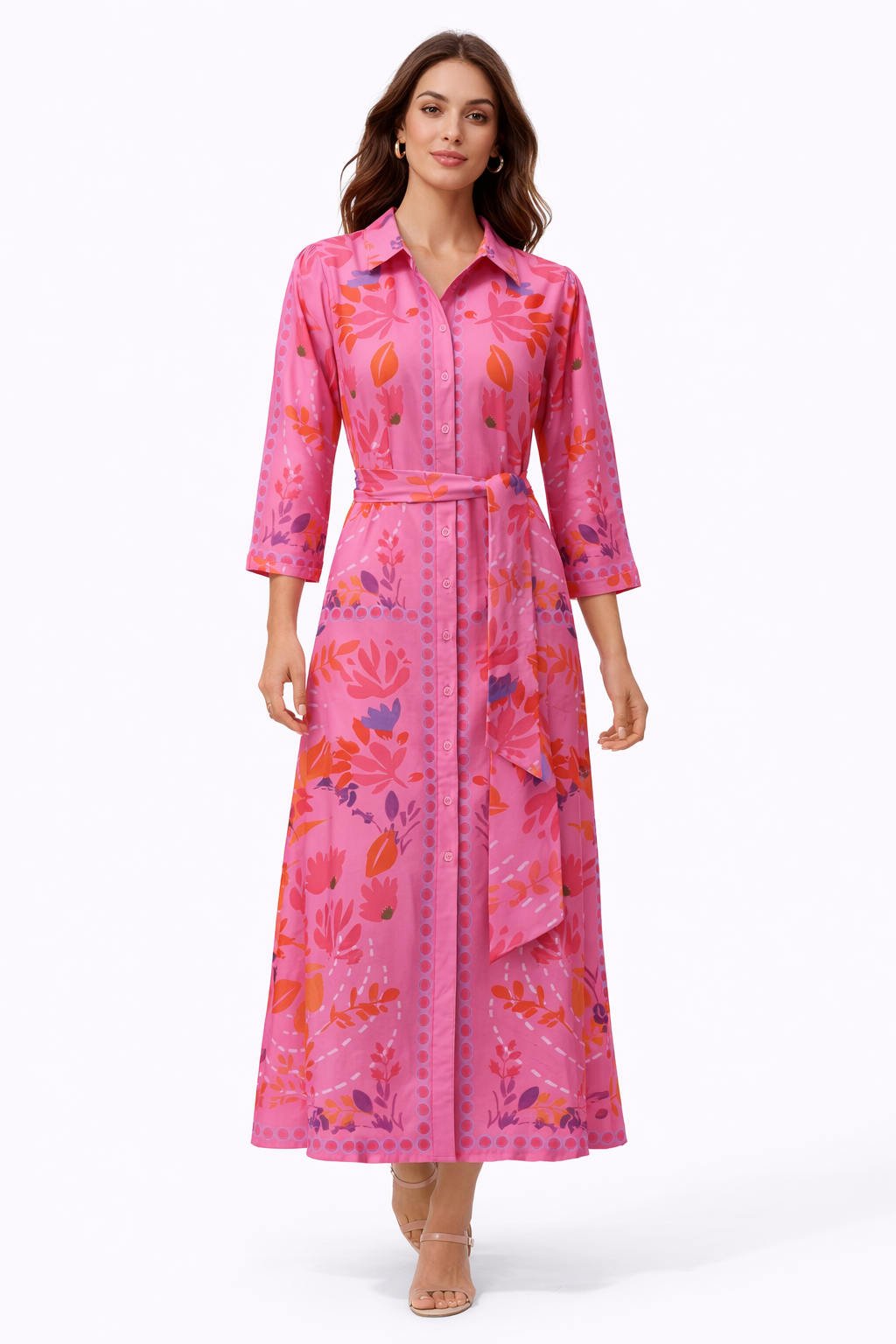 Add a pop of colour to your wardrobe with this stunning K-Design shirt dress, featuring a vibrant pink base with bold floral accents in coral, orange and soft purple tones. Designed with a flattering button-through front and a matching tie belt, this dress cinches beautifully at the waist while offering effortless comfort and movement.
