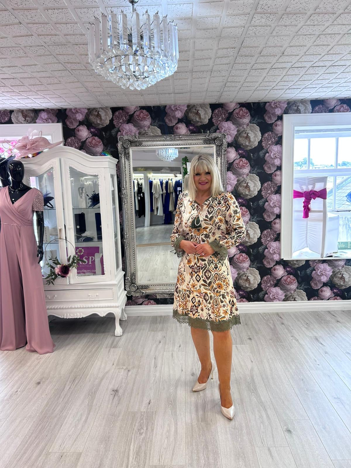 Step into effortless bohemian elegance with the K Design B114 dress. Crafted in a soft, lightweight fabric, this flattering A-line dress features a warm-toned floral and geometric print, finished with statement khaki crochet trim on the cuffs and hem for a beautifully detailed touch.