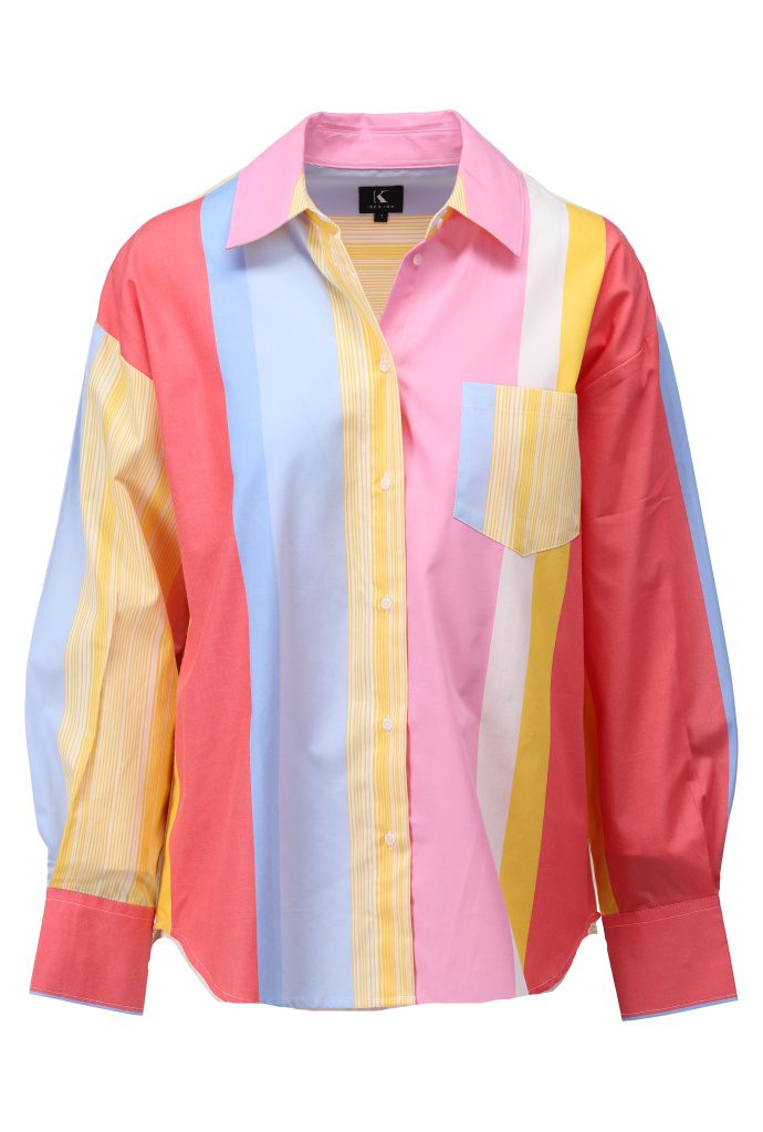 The top is a color-blocked button-down shirt with pastel shades of pink, yellow, blue, and coral, tied at the waist for a relaxed, stylish vibe. It's paired with a light-wash high-waisted pencil skirt that keeps the look fresh and polished.