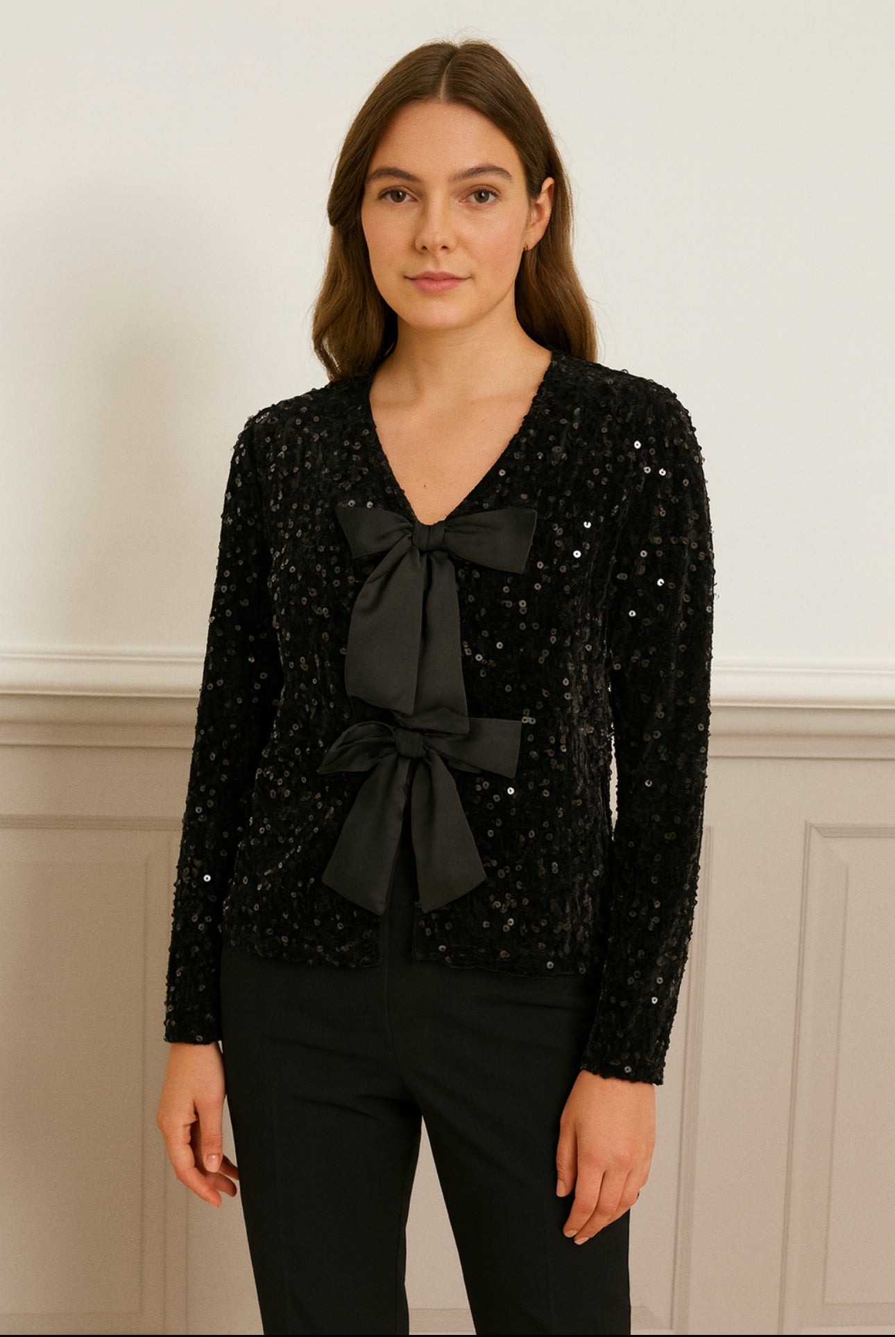 This is a glamorous black sequin top designed to make a statement. It features a fitted silhouette with long sleeves and a V-neckline, fully embellished with shimmering sequins for a bold, eye-catching finish. Two oversized black satin tie bows adorn the front, adding a playful yet sophisticated contrast. Perfect for festive occasions, evening events, or holiday parties, this piece balances sparkle with elegance.
