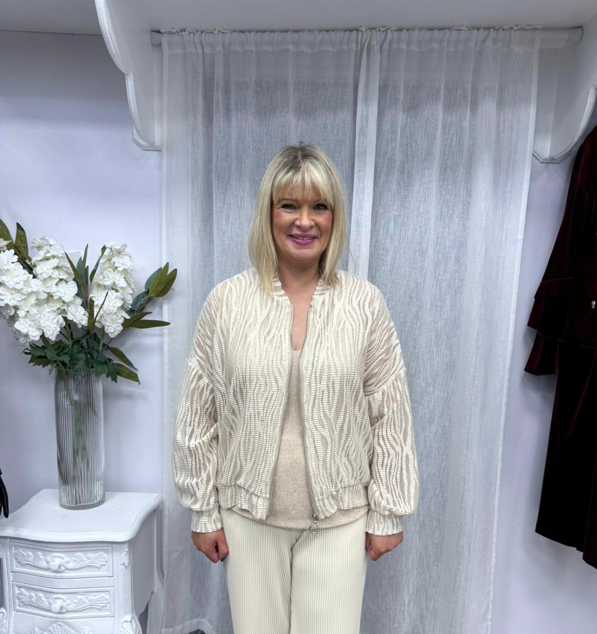 The jacket in the image is a lightweight, semi-sheer bomber-style piece in a soft cream shade. It features a subtle textured pattern with a wavy, metallic thread design that catches the light beautifully. The cuffs, collar, and hem are ribbed for a clean, structured finish, while the overall fit remains relaxed and elegant. It’s a versatile layering piece that adds a touch of shimmer and sophistication, perfect for both casual and dressy looks.