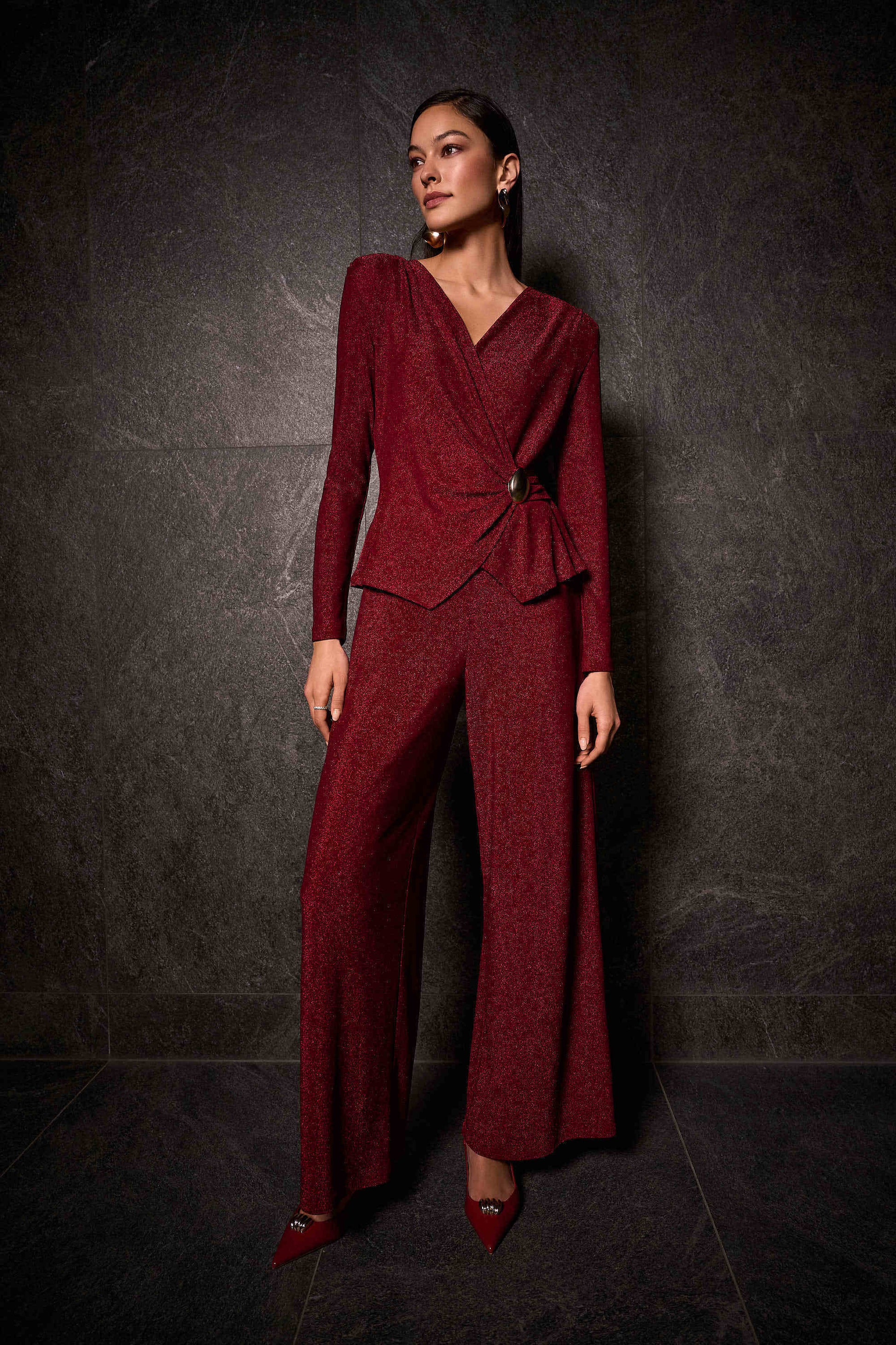 Embrace the sophistication of this Lurex knit jumpsuit designed with an alluring wrapped bodice and a beautiful old abstract ornament. The wide-leg silhouette adds poise to every step and timeless appeal to the piece.