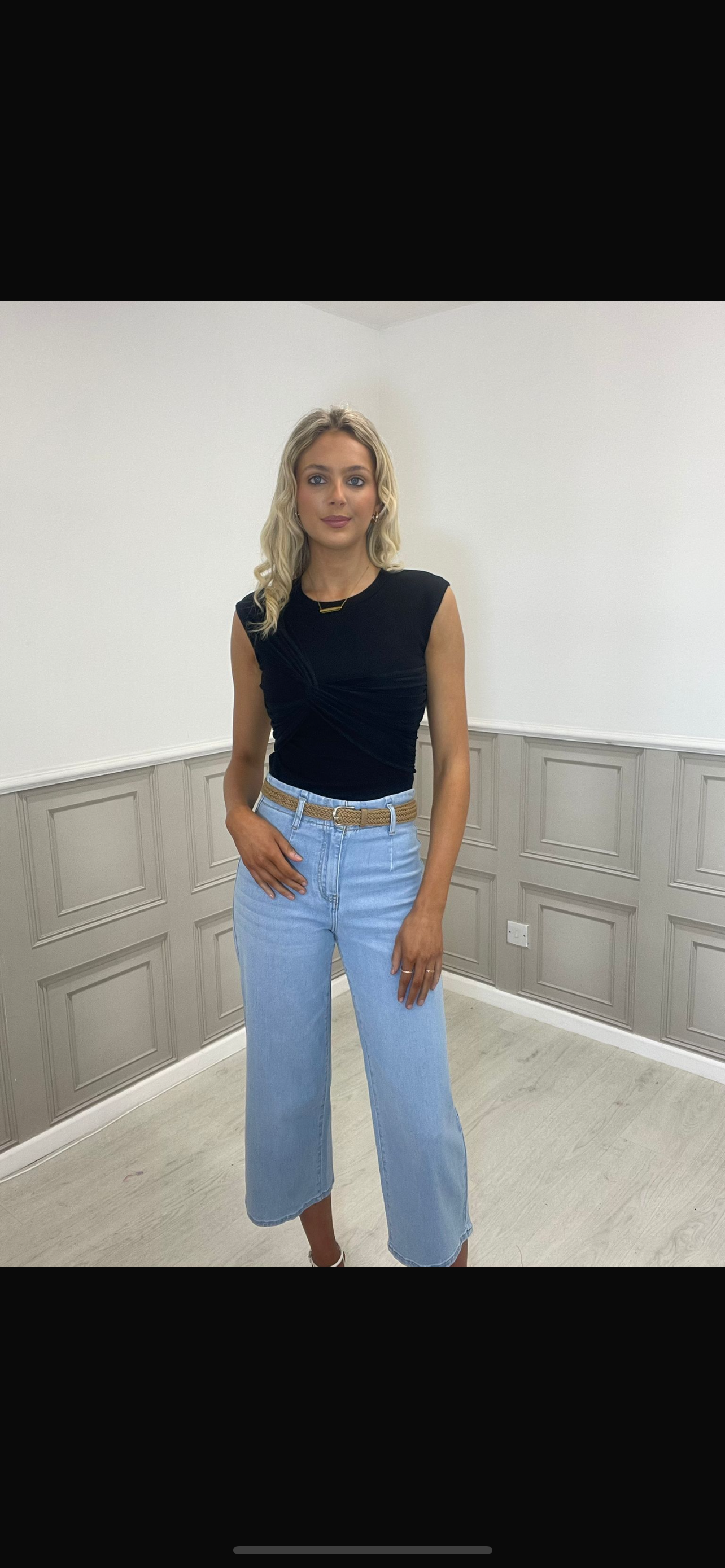 This black top is sleeveless with a unique and stylish gathered twist detail at the front. The twist design creates a knotted appearance across the chest,