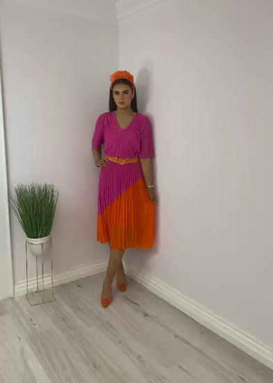 A stunning pink /orange dress with a soft pleat and v neckline.