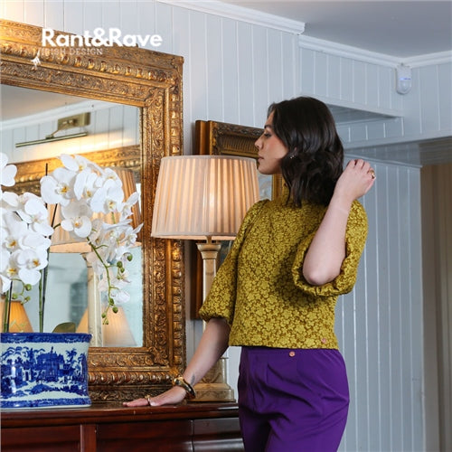 Beautiful puff sleeve design and higher neckline in a mustard /green autumn colour .