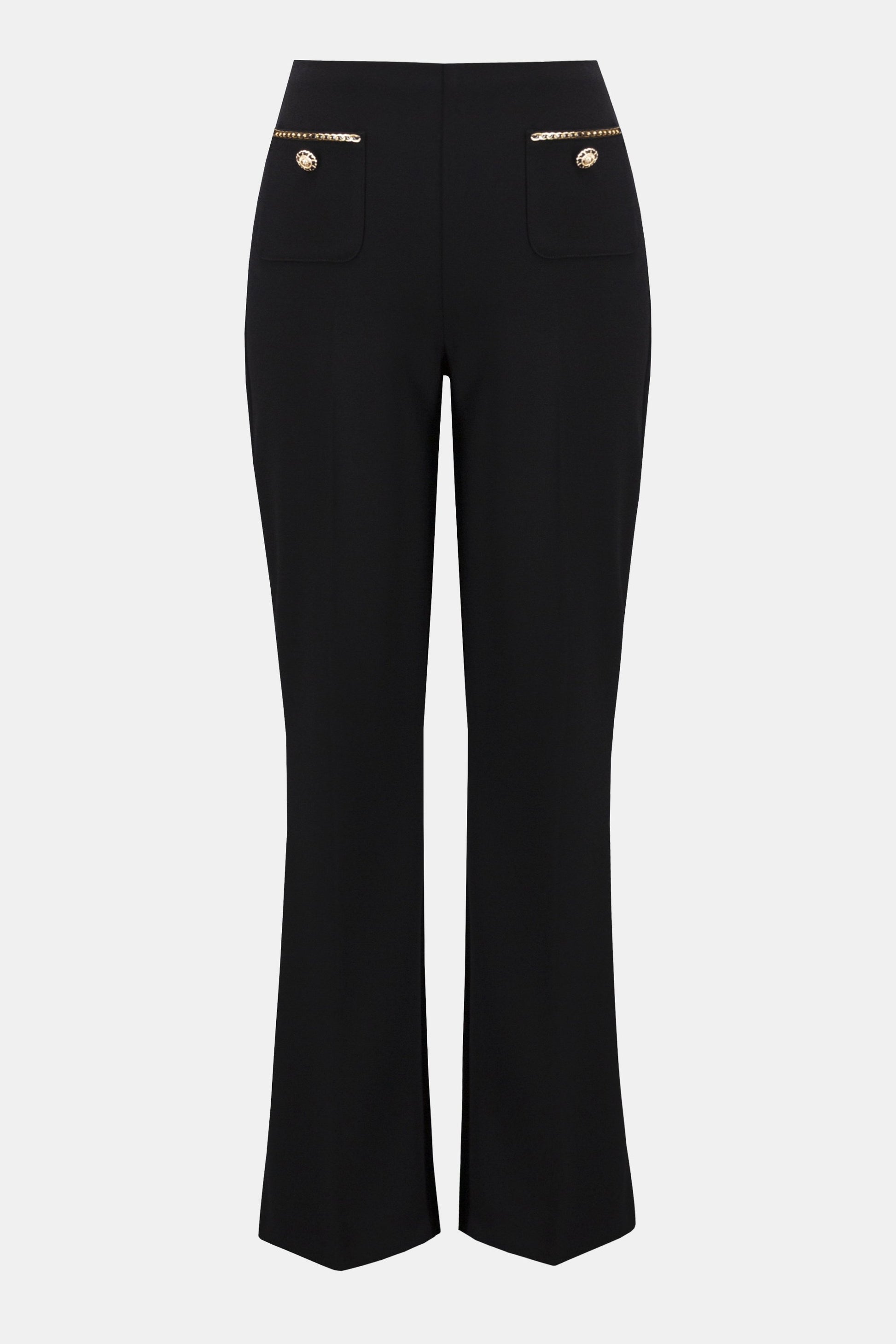 These scuba crepe pull-on pants are tailored in a classic straight silhouette that flatters any figure. The front applied pockets with gold embellished details and buttons elevate the garment’s polished look.