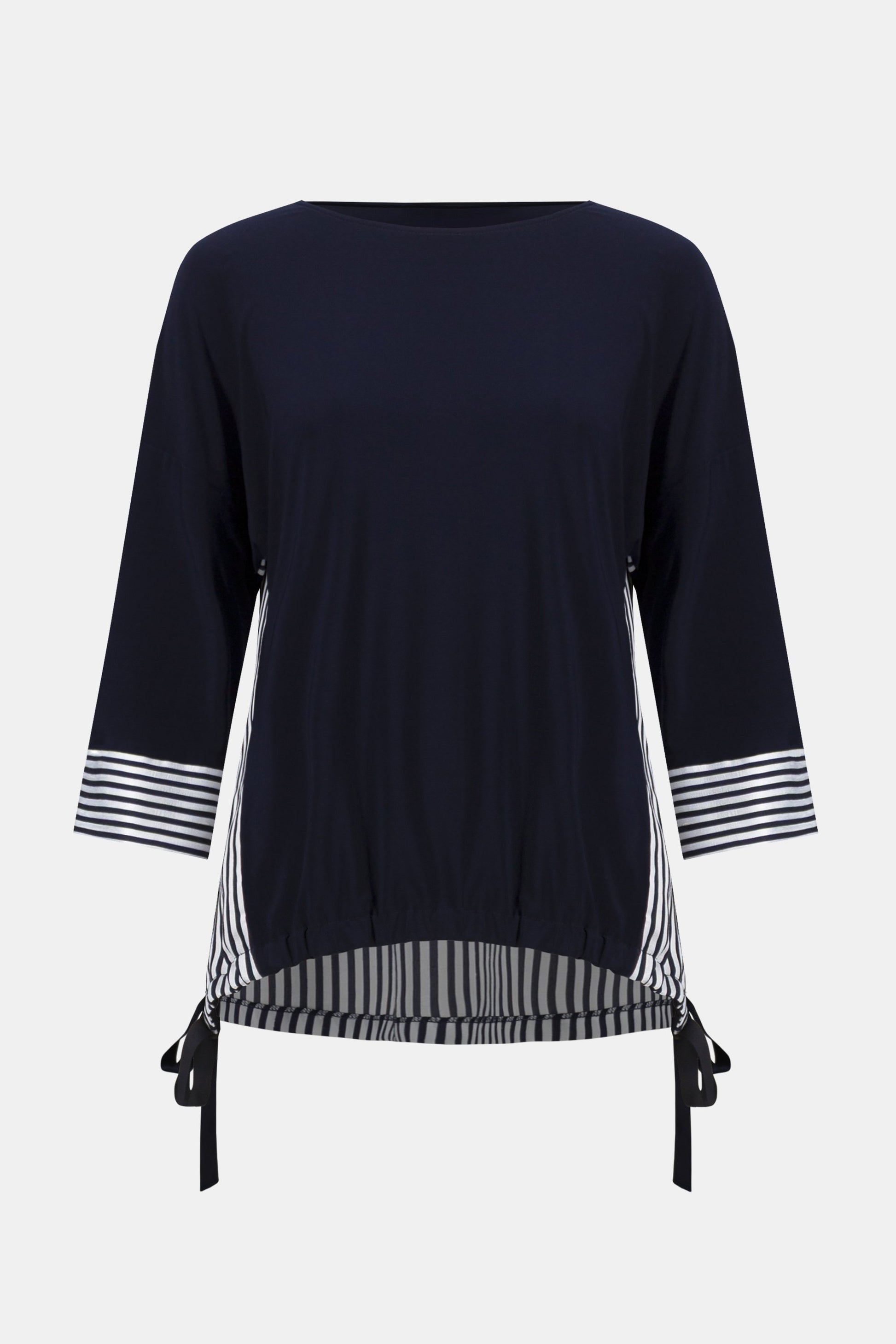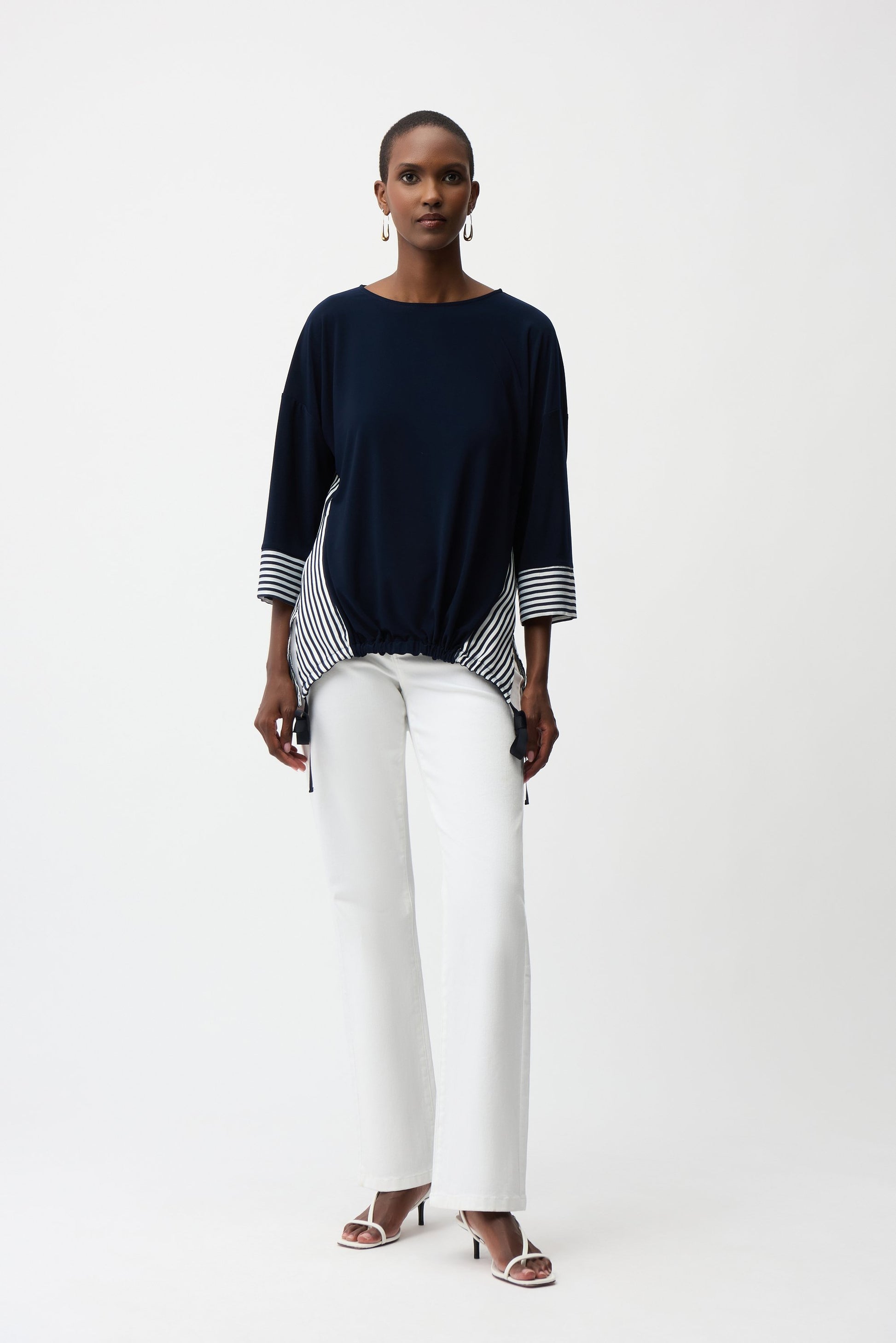Relaxed yet refined, this silky knit and striped woven top features a wide boat neckline, three-quarter dolman sleeves with cuffs, and a grosgrain drawcord at the front hem. The high-low hem and back yoke add a soft structure.