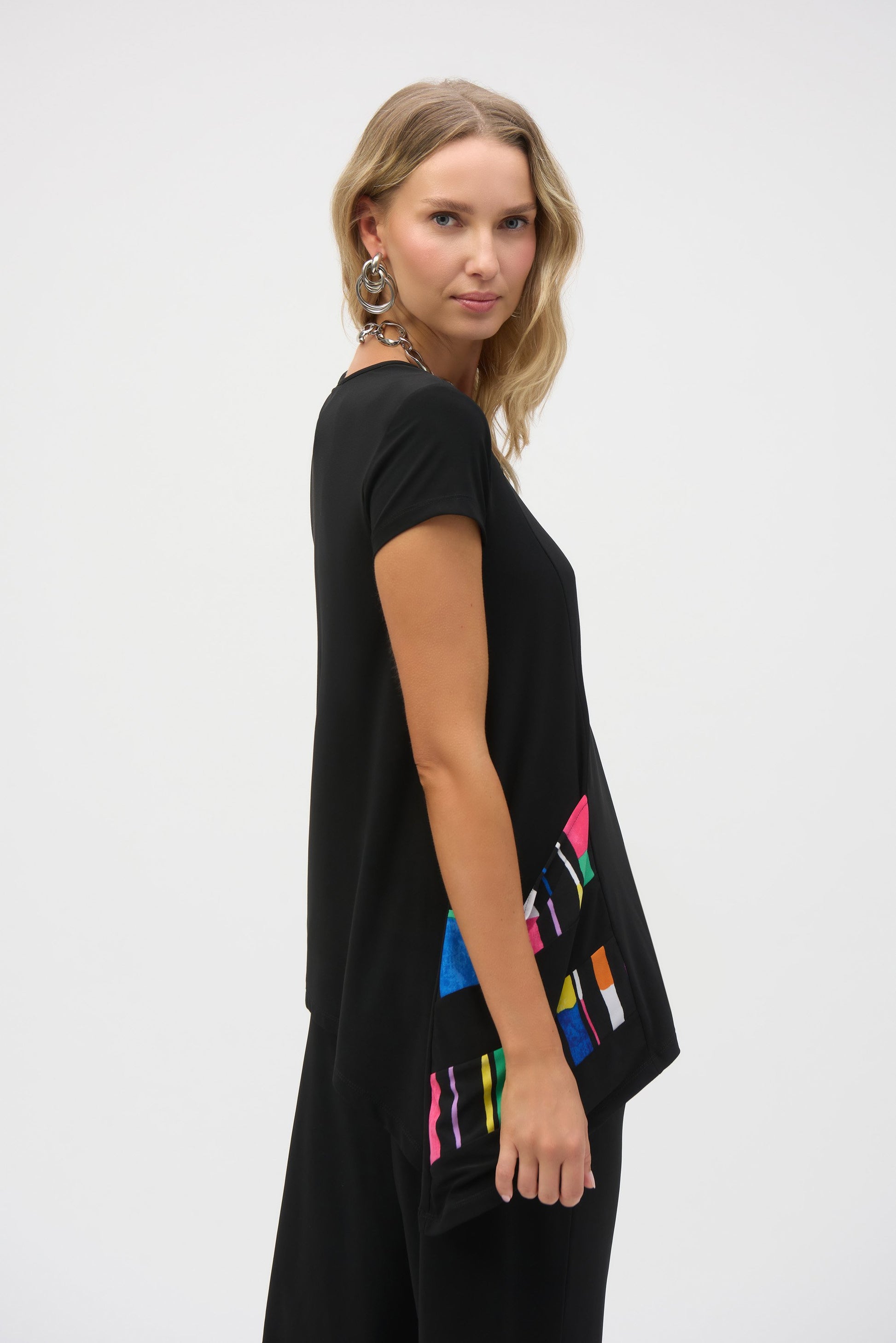 Refined style at its very best. This silky knit tunic unique charm elevates any ensemble, with its lovely handkerchief detail at the hem. The scoop neckline and sleeveless design pair beautifully, lending the garment it’s simple elegance. The striped print band on the applied pockets accentuates the piece’s stunning contemporary look.