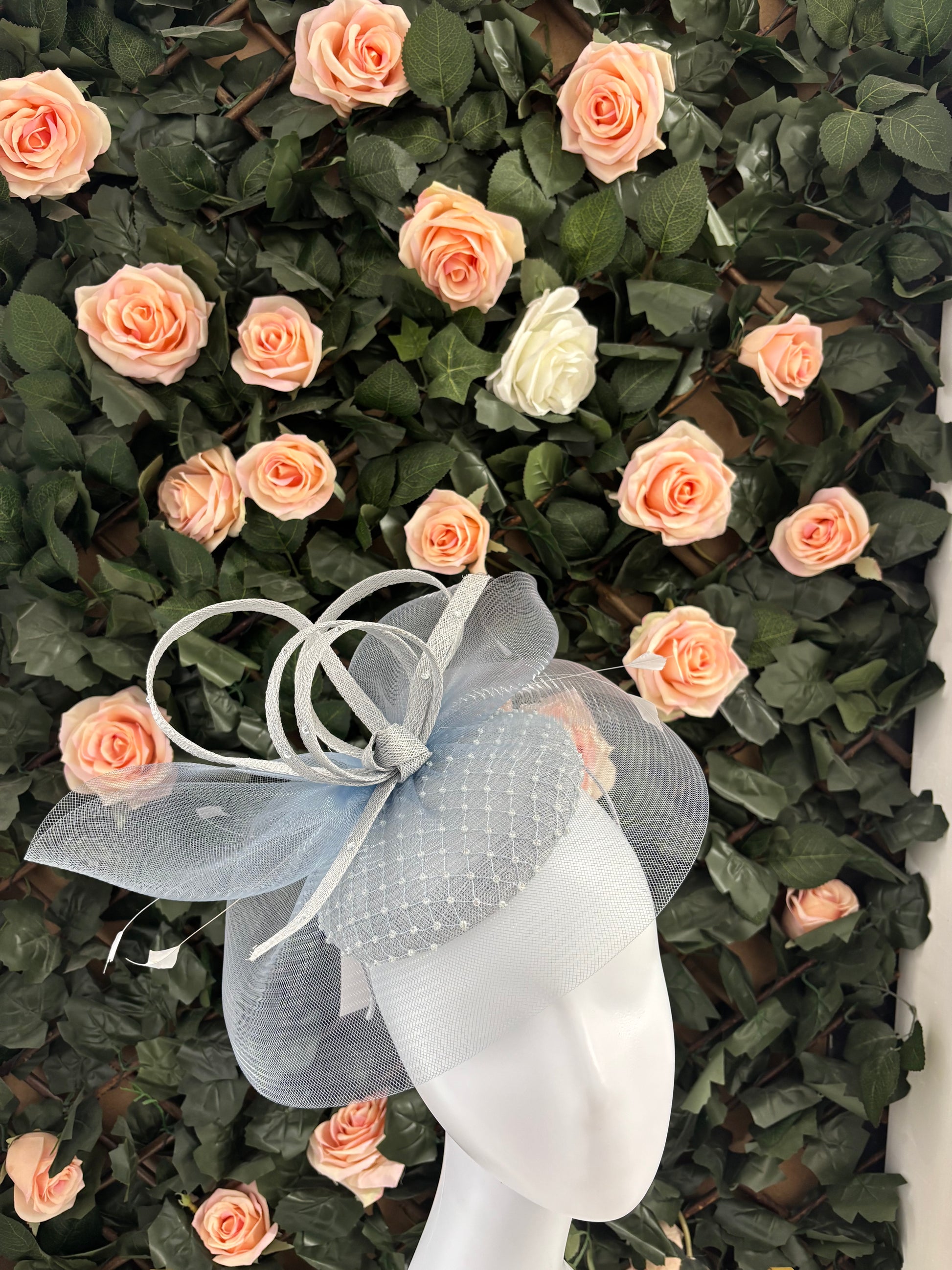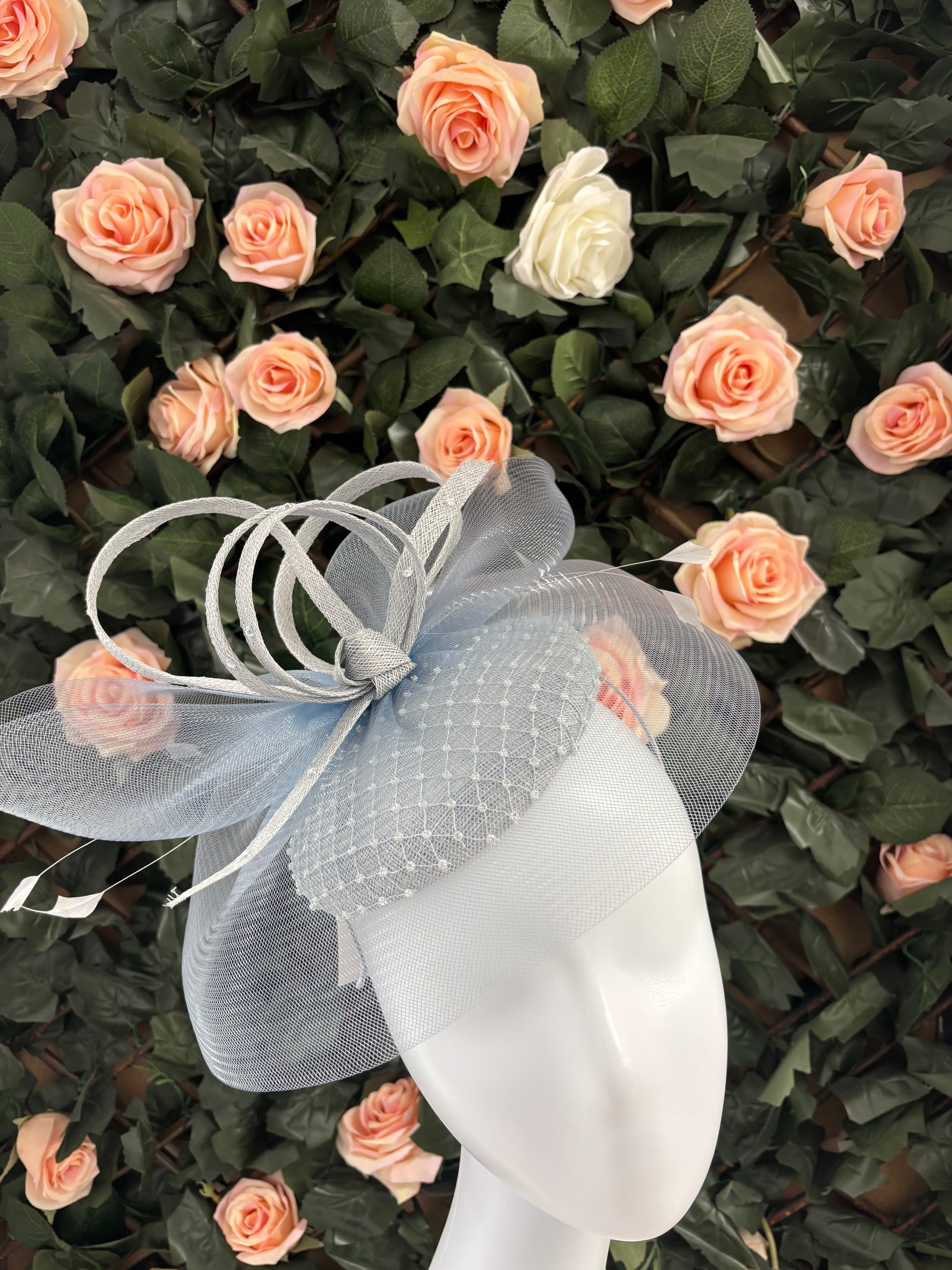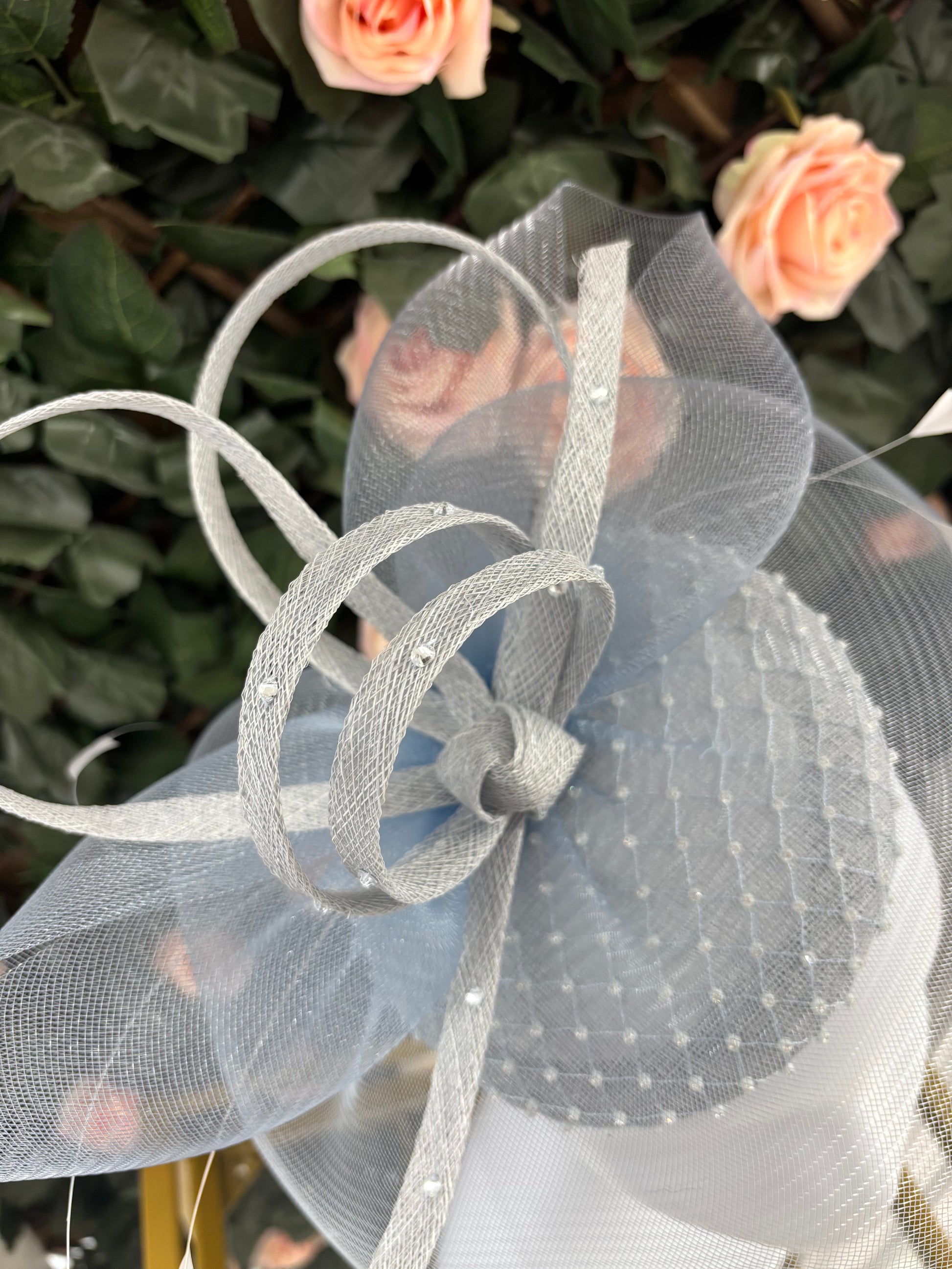 This is a refined pale blue fascinator that exudes quiet sophistication. The design features a structured sinamay base overlaid with a delicate dotted veil, adding texture and a touch of vintage grace. From the center, sculpted loops of matching grey sinamay rise in elegant arcs, accented with subtle pearl-like embellishments that catch the light softly.