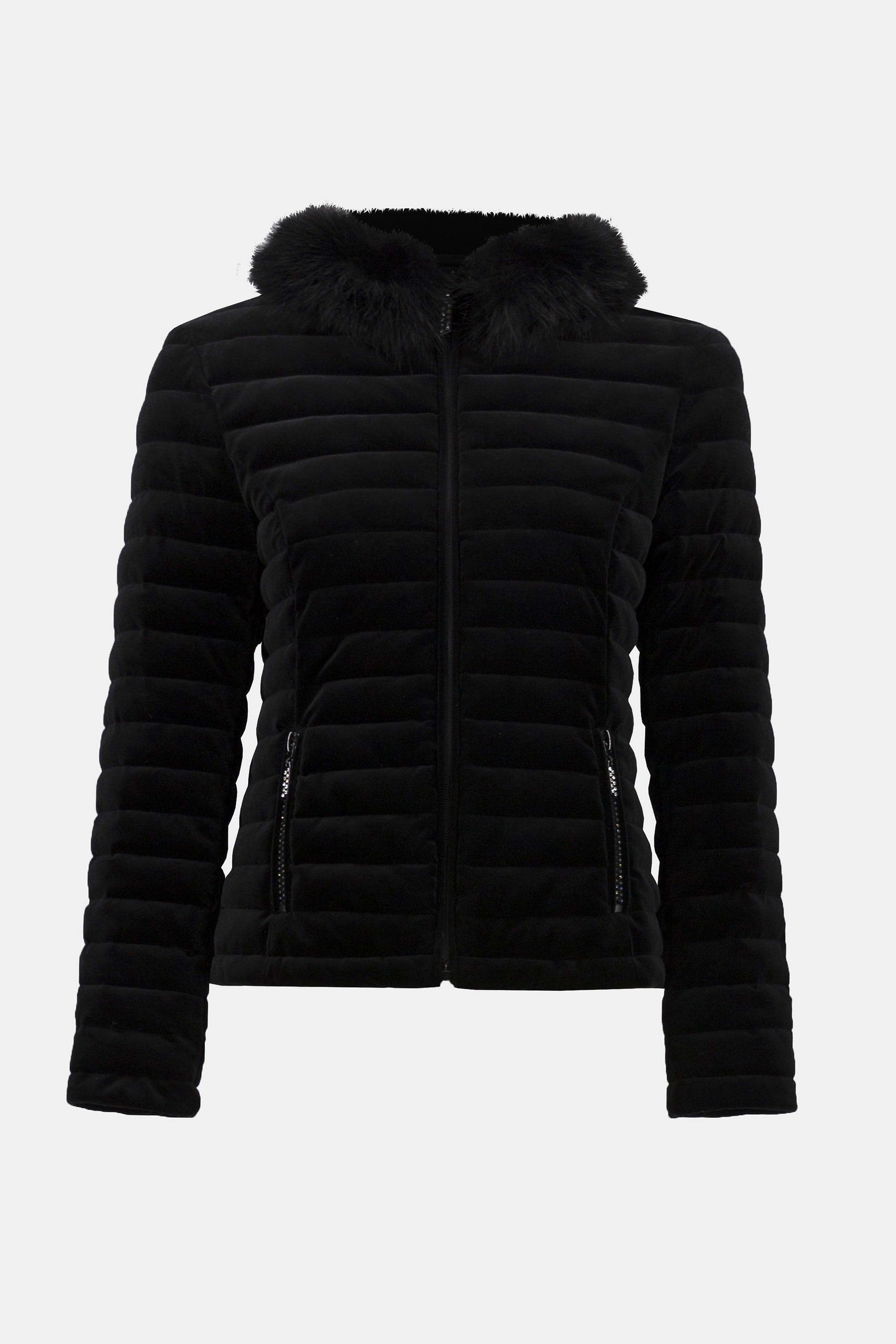 Stretch Velvet Puffer Jacket with Faux Fur Collar 253928