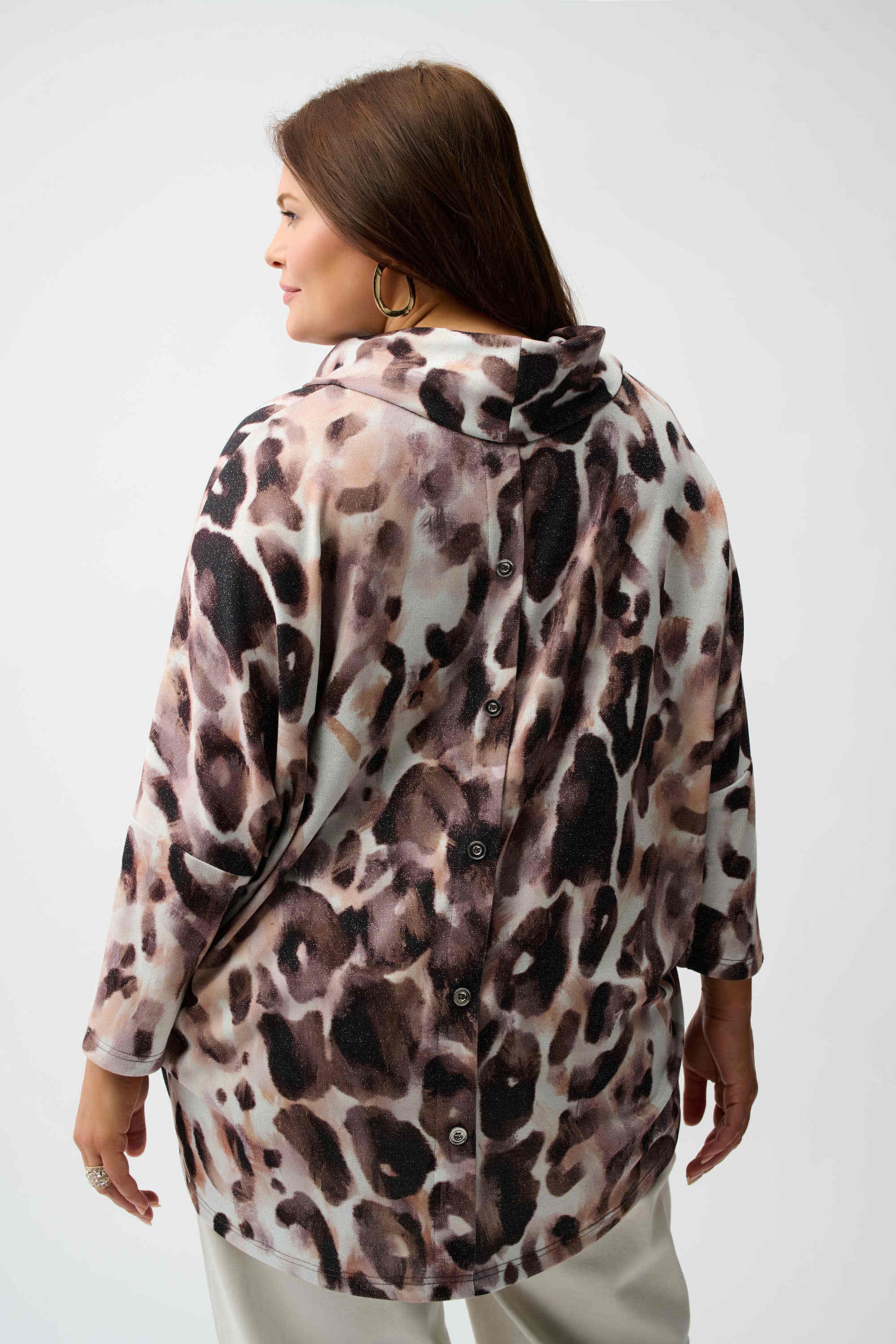 This sweater knit tunic showcases a relaxed boxy silhouette boasting an alluring animal print. The draped cowl neck and three-quarter dolman sleeves lend the piece its refined feel while the button detail at the centre back adds a touch more of flair.