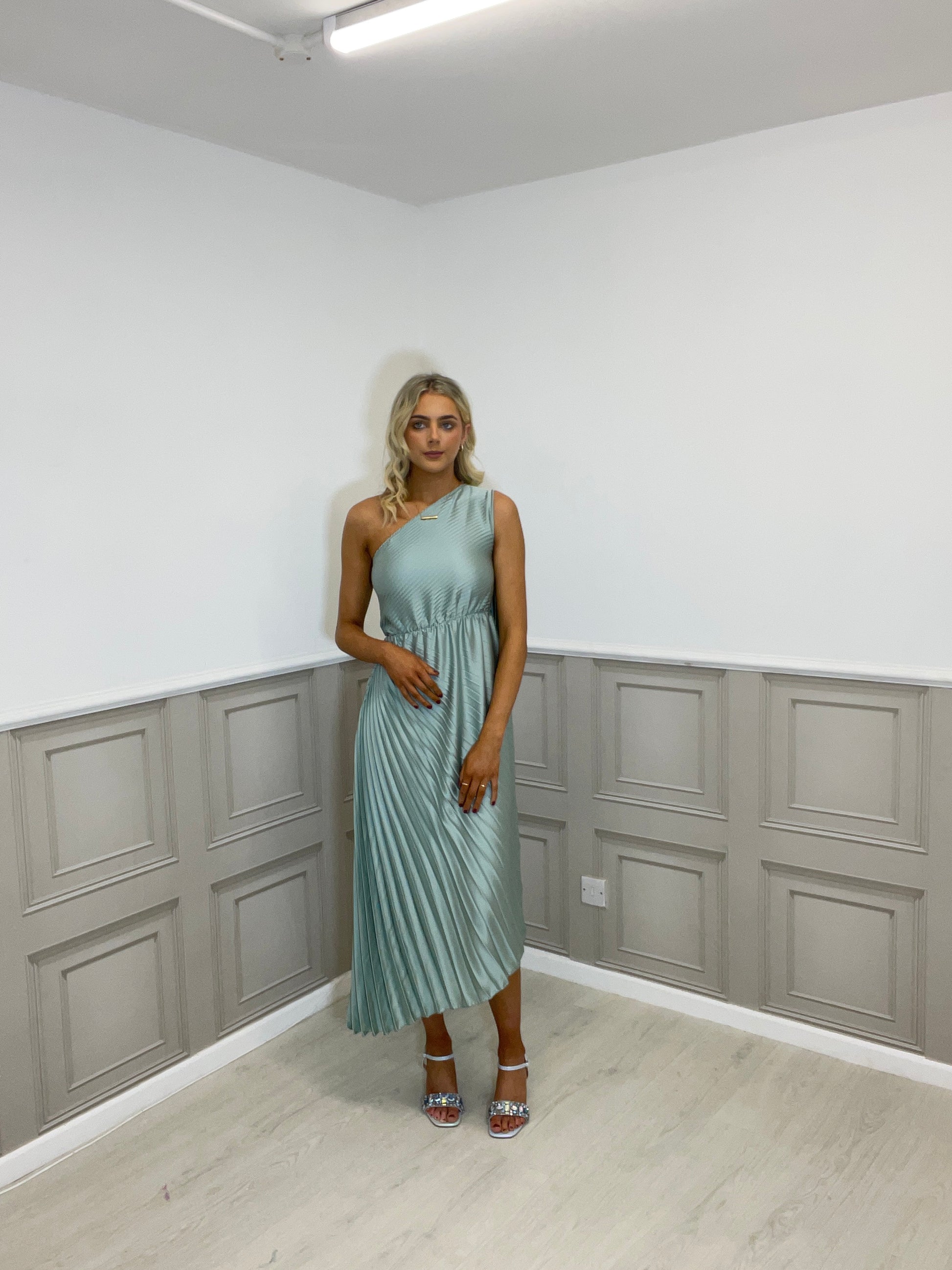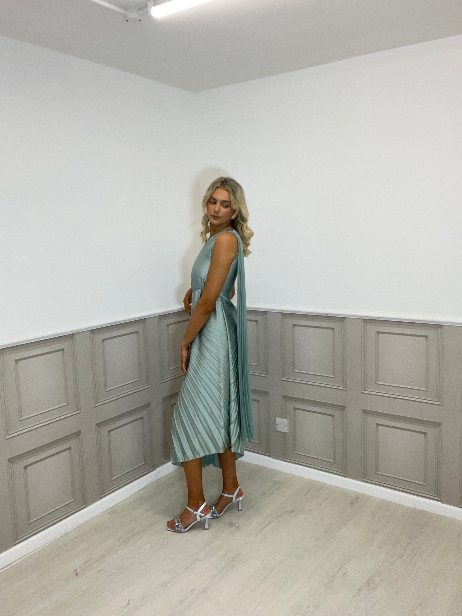 A beautiful stylish one shoulder dress with a fine soft pleat, a stylish scarf draping over the shoulder which enhances the elegance of this beautiful dress .
