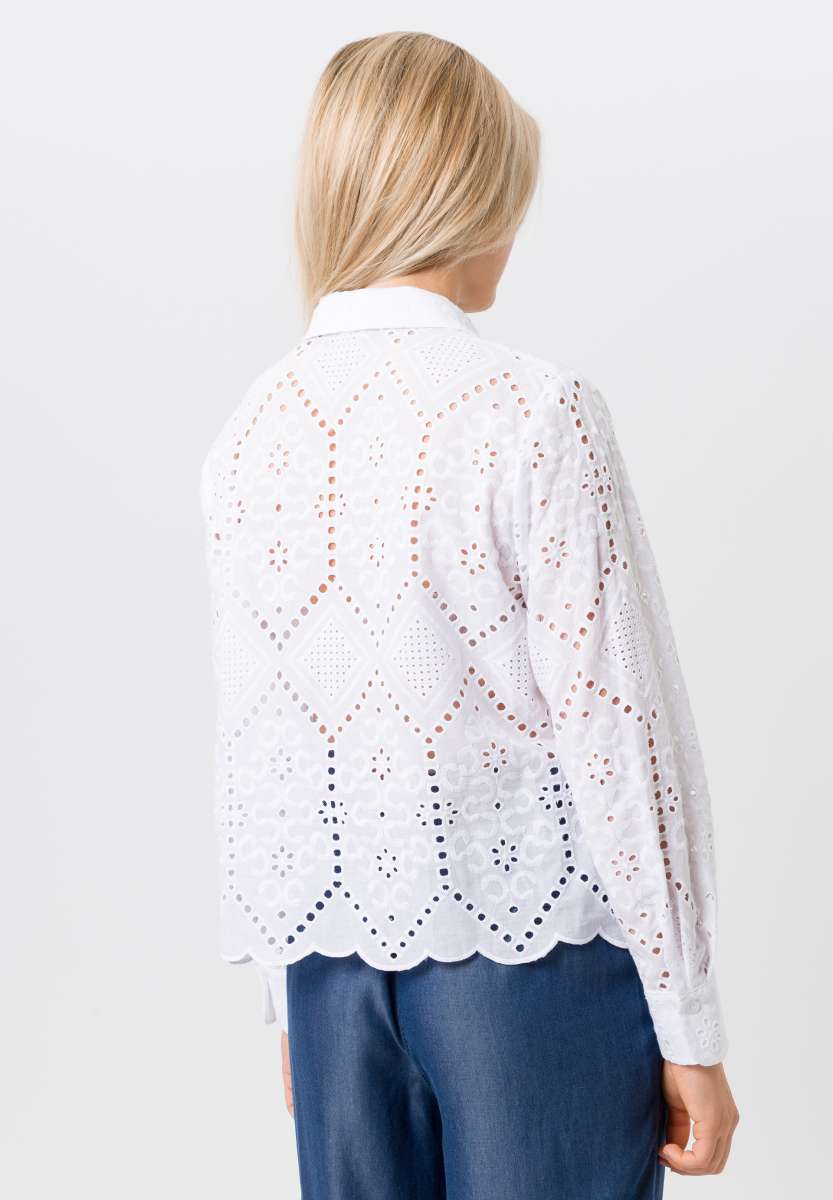 Elegant blouse with delicate eyelet embroidery, full-length button placket and wavy hem – a feminine statement for versatile looks.