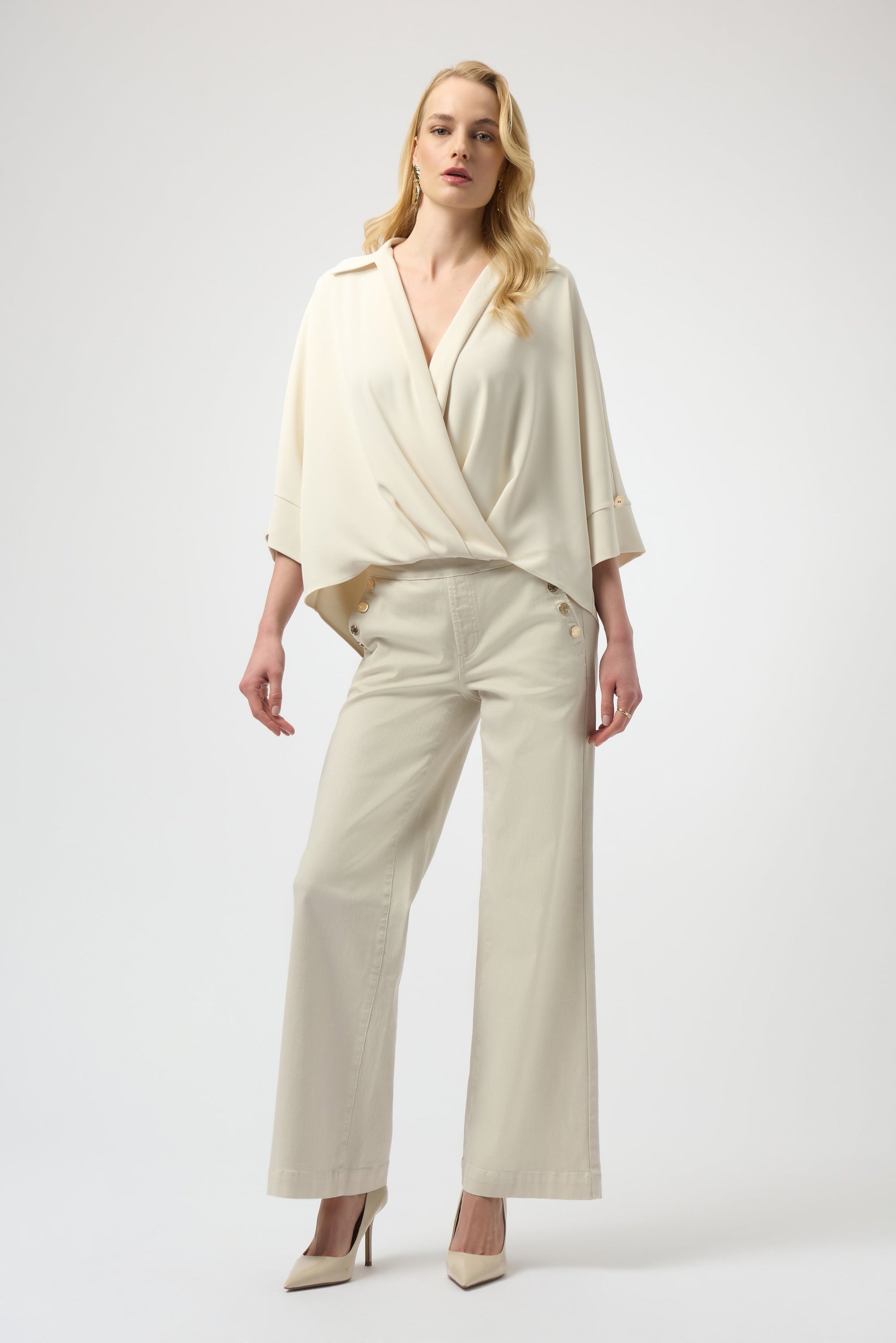 Embrace the sophistication of this woven twill wrap top tailored in a bold boxy silhouette with front pleats. The shirt collar and three-quarter dolman sleeves with cuffs elevate the piece’s undeniable appeal.