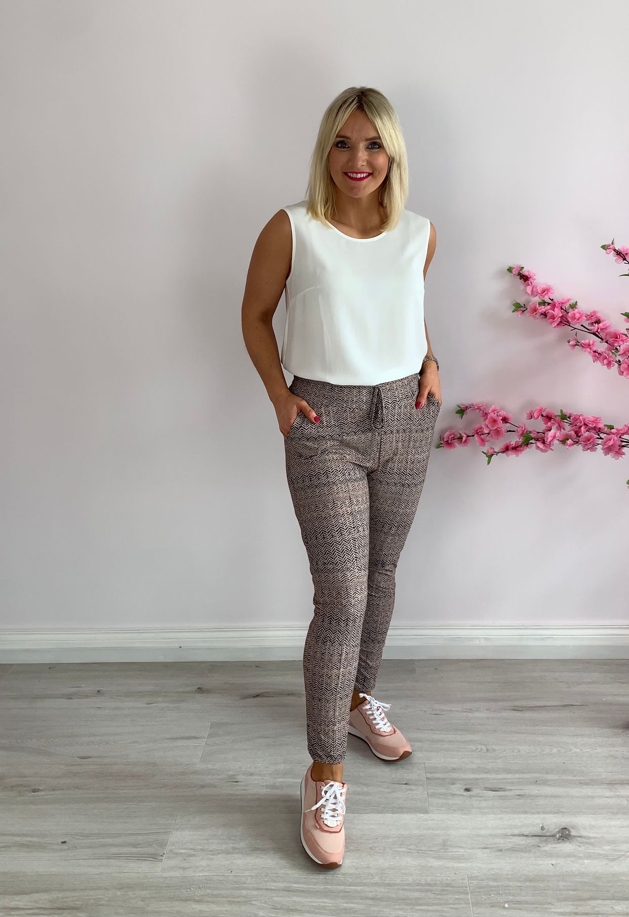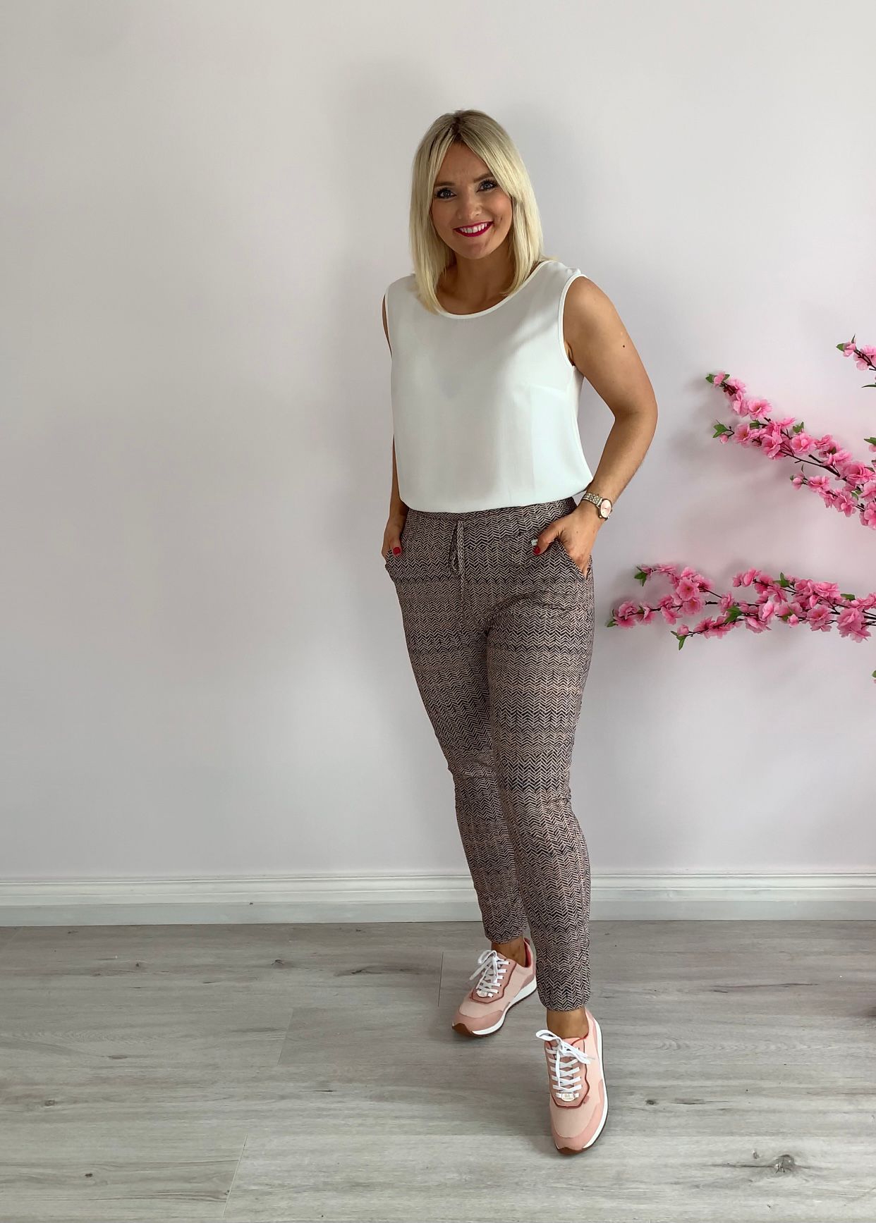 Beautiful soft travel fabric bottom with a peach and navy tone.